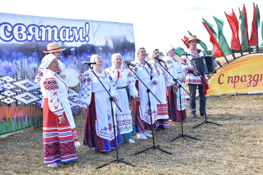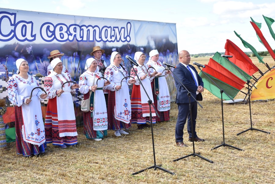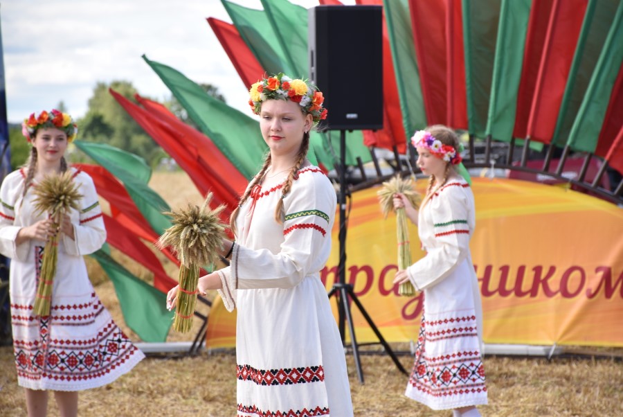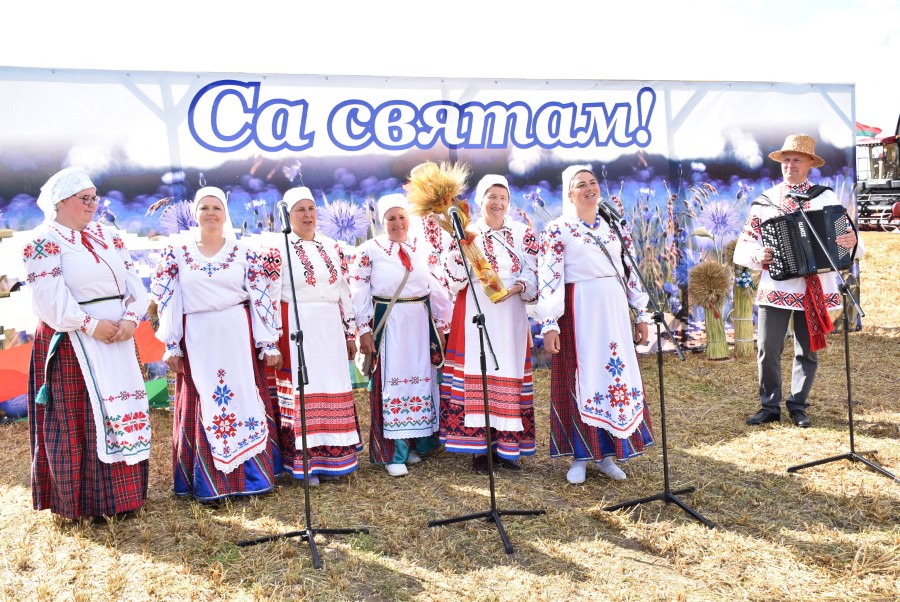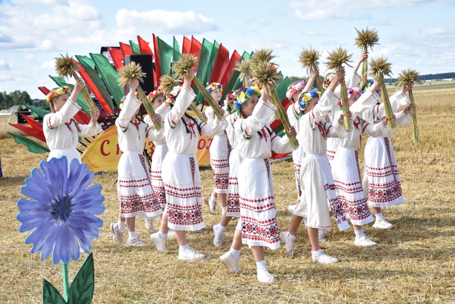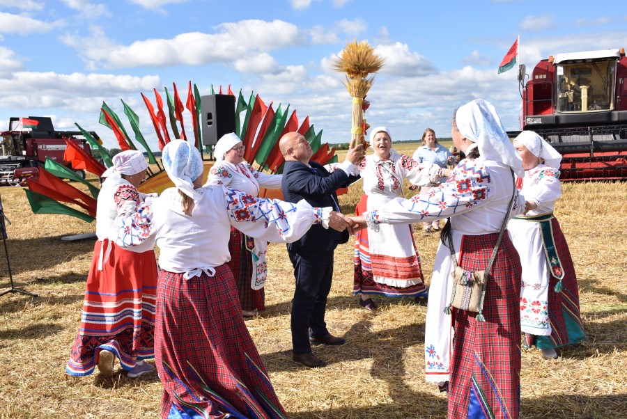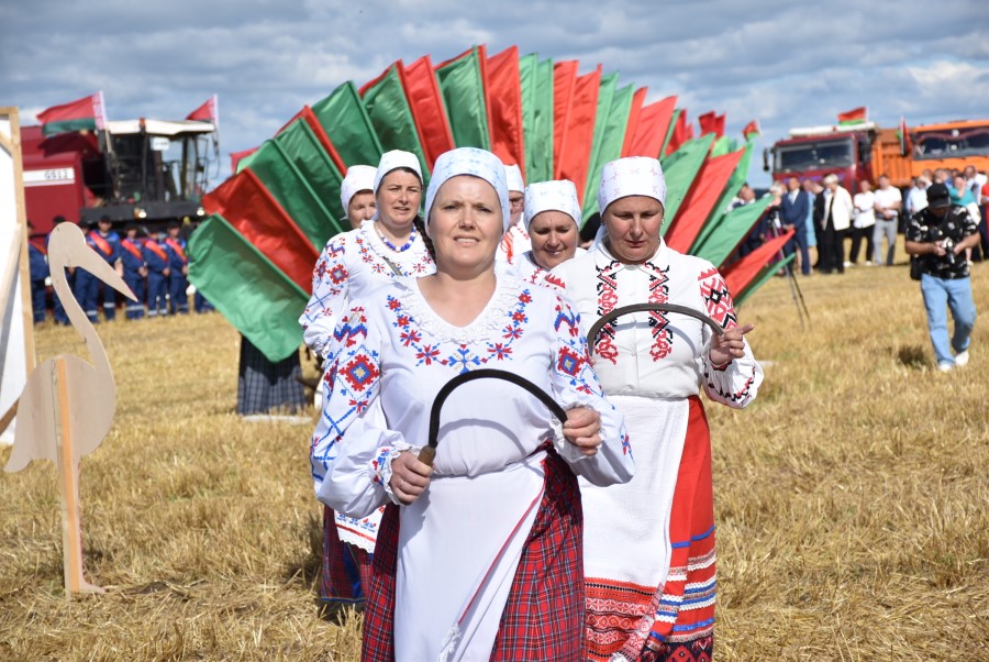 И вот наступает пора жницам по-старинке, серпами, с песнями начинать зажинать уже выспевшее зерно, чтобы затем сделать из него первый зажиночный сноп «на сто коп, на тысячу мерак. Вышэй снапок ад гары и яснейшы ад зары». Вот он – весомый, колосистый, золотой – взлетает в руках Андрея Соколовского высоко в небо. И пока Андрей Валентинович подбрасывает его, все загадывают, чтоб прошла жатва без потерь, чтобы техника не ломалась и чтобы Бог дал здоровья всем участникам жатвы.