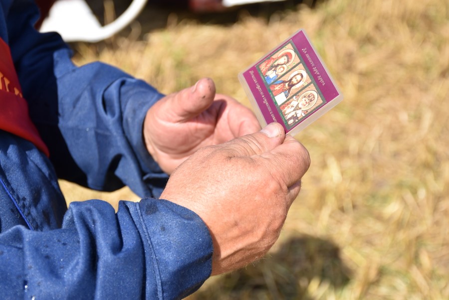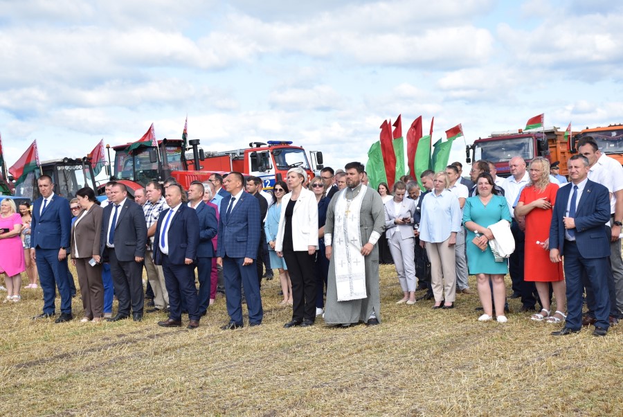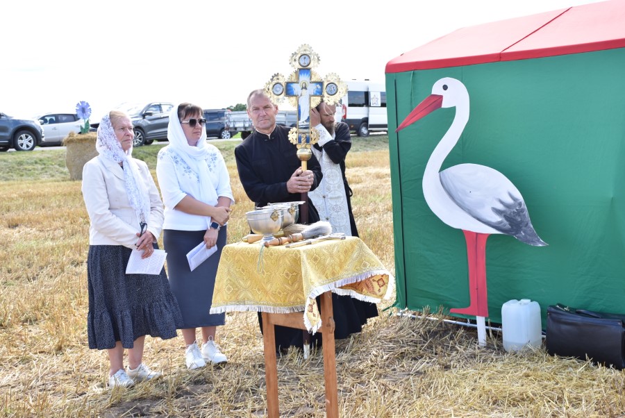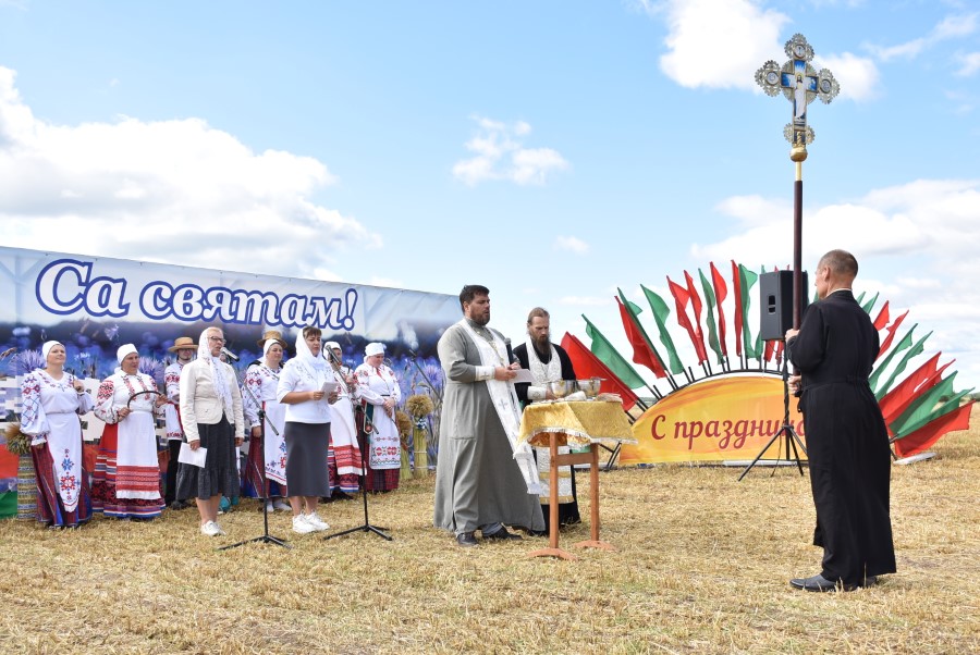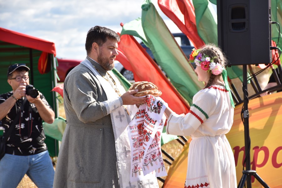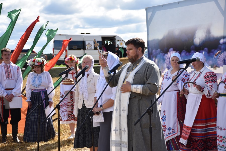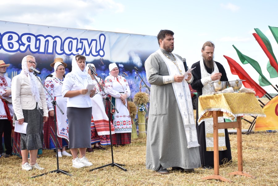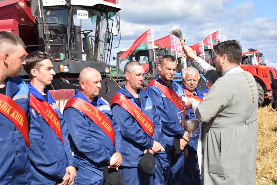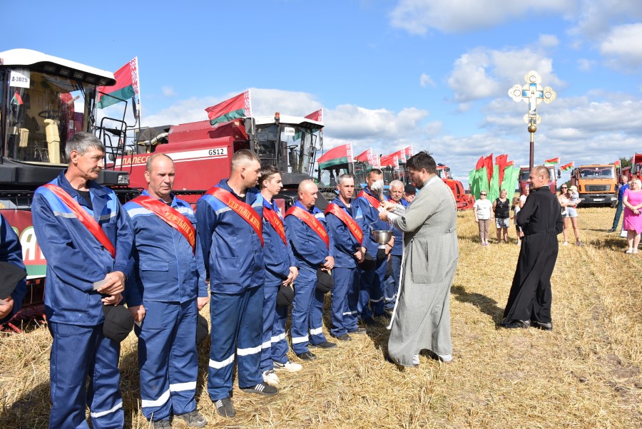 Наши предки знали, что прежде, чем приступить к уборке урожая, нужно было договориться с землей-матушкой и поблагодарить ее за подаренный урожай. За золотое поле – хвала господу Богу. Для того, чтобы не оставлял он нас и на этот раз, помогал в святом деле жатвы, а труды наши сторицей окупались богатым урожаем, на празднике был совершен молебен. Совершил его благочинный Березинской церковного округа протоиерей Илья Гончарук. Он же окропил святой водой поле, технику и участников жатвы. Кроме того, комбайнерам, как встарь, дали в дорогу для укрепления сил не только духовных, но и физических, обязательные белорусские «ссобойки».