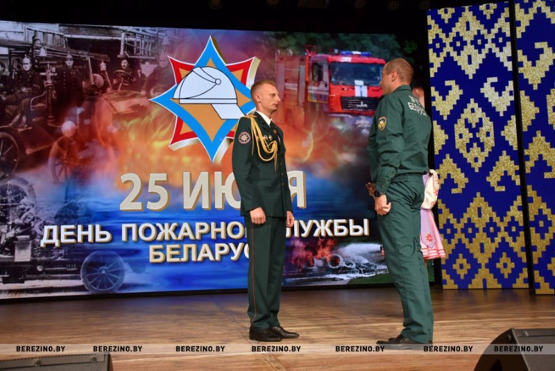 Затем на сцену один за одним начали подниматься гости праздника. Причем, не только поздравить огнеборцев с их профессиональным праздником, но и вручить грамоты за активное взаимодействие в работе. Первым эту церемонию открыл прокурор Березинского района Василий Вербицкий. Он вручил благодарности прапорщику внутренней службы Артему Горошко - старшему инструкторы ПАСП №13 и прапорщику внутренней службы Дмитрию Тюлюпо – водителю ПАСП №12.