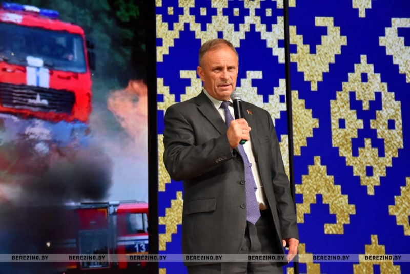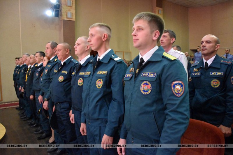 В завершении мероприятия к собравшимся обратился Николай Андриевич. Он от имени республиканского добровольного пожарного общества вручил нагрудный знак “Сто лет со дня образования Всебелорусского добровольного пожарного общества” начальнику Березинского РОЧС Ивану Мазанику, майору внутренней службы Констанину Богачу – инспектору инспекции надзора и профилактики, старшему лейтенанту внутренней службы Наталье Киселевой – оперативной дежурной центра оперативного управления. Нагрудный знак “За заслуги” был вручен старшему лейтенанту внутренней службы Алексею Кривороту – заместителю начальника РОЧС..jpg)