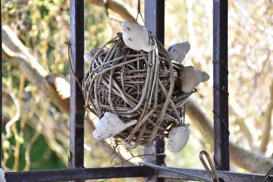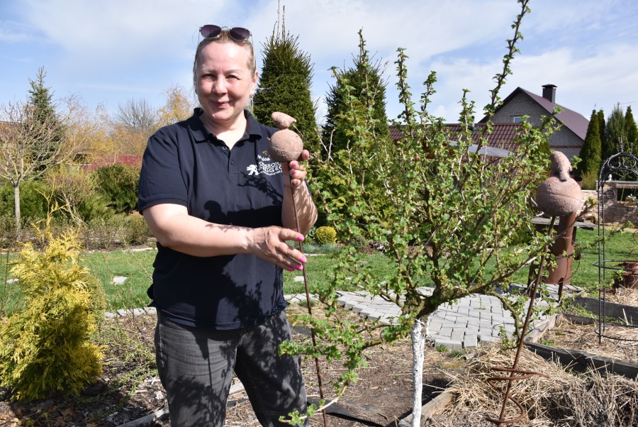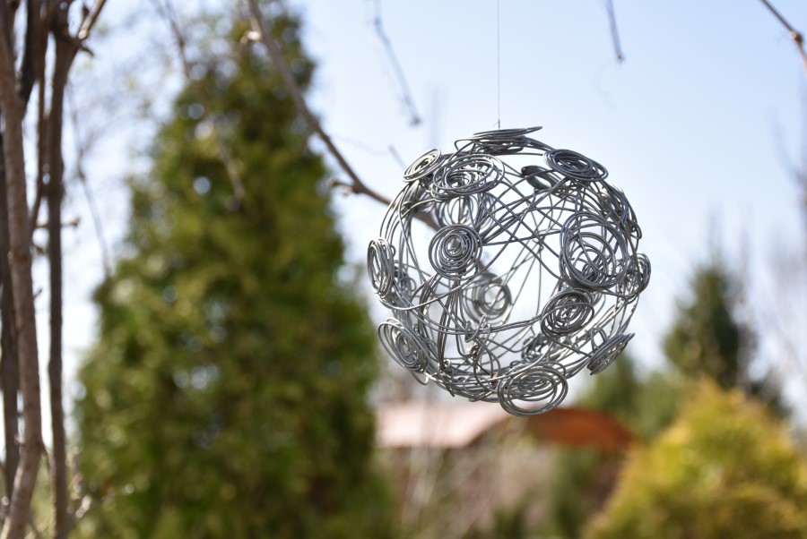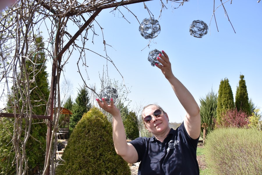 – Шары я скрутила из простой проволоки, – говорит Елена Николаевна, – они получились вот с таким рисунком. А вот эти шары вдоль огородика сделаны из виноградной лозы. Всё очень сочетается и смотрится оригинально. Многим интересны фигурки, для создания которых используют ветки, брёвнышки, камни, коряги и другие природные элементы. Они могут быть как абстрактными, так и в виде животных, людей или сказочных персонажей.