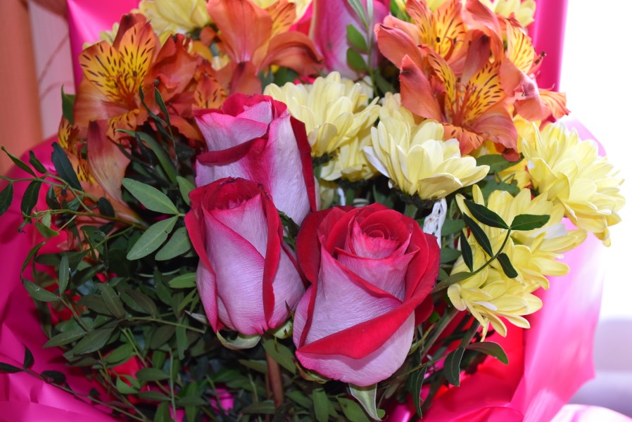 Почетная грамота, цветы, холст, фруктовая корзина и телевизор.