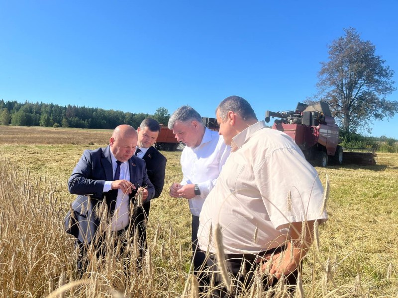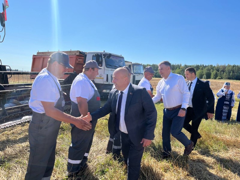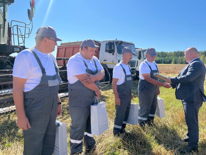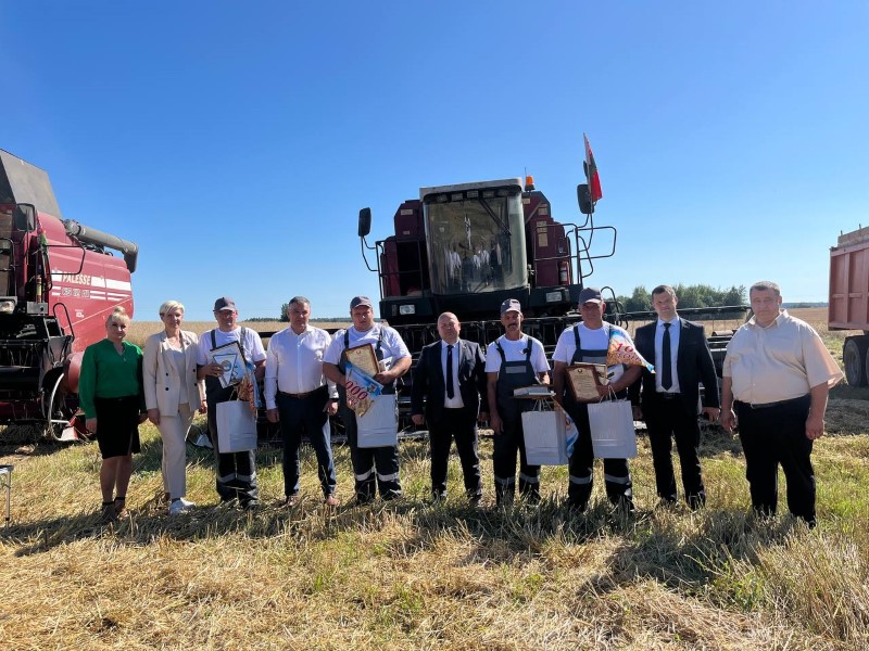Сегодня передовиков жатвы на поле чествовали, начальник главного финансового управления Миноблисполкома Николай Куховец, председатель районного исполнительного комитета Андрей Соколовский, первый заместитель Александр Крук, председатель профсоюза работников АПК Екатерина Аврамчик, директор ОАО «Первомайский» Александр Соловьев.