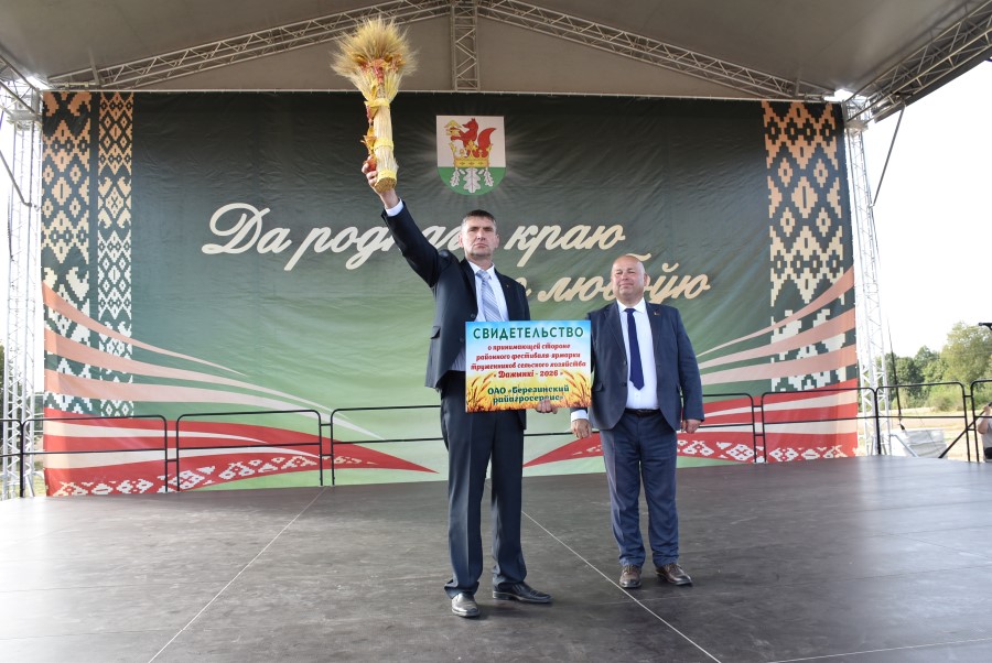 На подобных мероприятиях не только высказываются слова благодарности принимающей стороне, но традиционно всегда называют и адрес следующих «дожинок». Провести их в 2026 году выпадает честь открытому акционерному обществу «Березинский райагросервис». Его директору Александру Автухову вручается соответствующее удостоверение, а также весомый дожиночный сноп. Что ж, будем с нетерпением ждать нового праздника. Он будет аж через год? А кто сказал, что это очень долго? Стоит лишь провести озимый сев, затем подкрепить его яровым, провести все необходимые мероприятия, сопутствующие росту семян, и вот снова она – жатва, ее герои и собранный урожай. Пусть и в следующем году он будет столь же весомым и богатым!