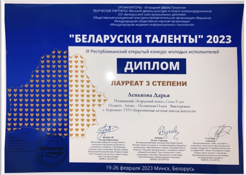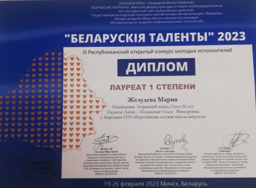 Учащиеся эстрадного отделения ГУО "Березинская детская школа искусств" пед. Литке-Полянская О.В. приняли участие в IX Республиканском открытом конкурсе молодых исполнителей "Беларускiя таленты 2023"