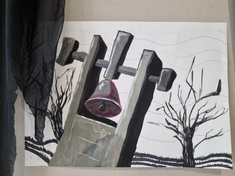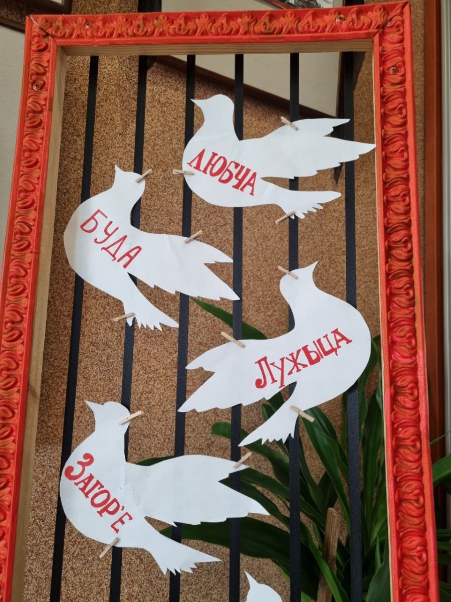 В память о 185 деревнях, сожжённых и не восстановленных после войны, ребята вырезали из бумаги белых голубей, символ мира и созидания, и написали на них красной краской их названия.