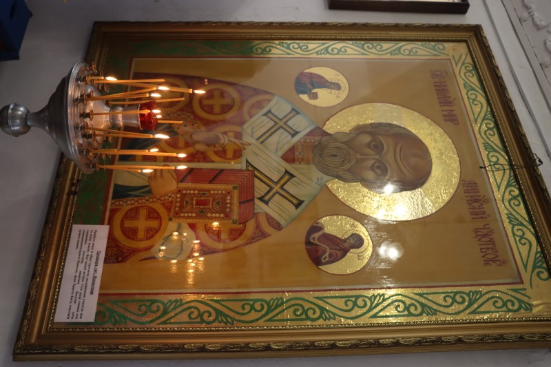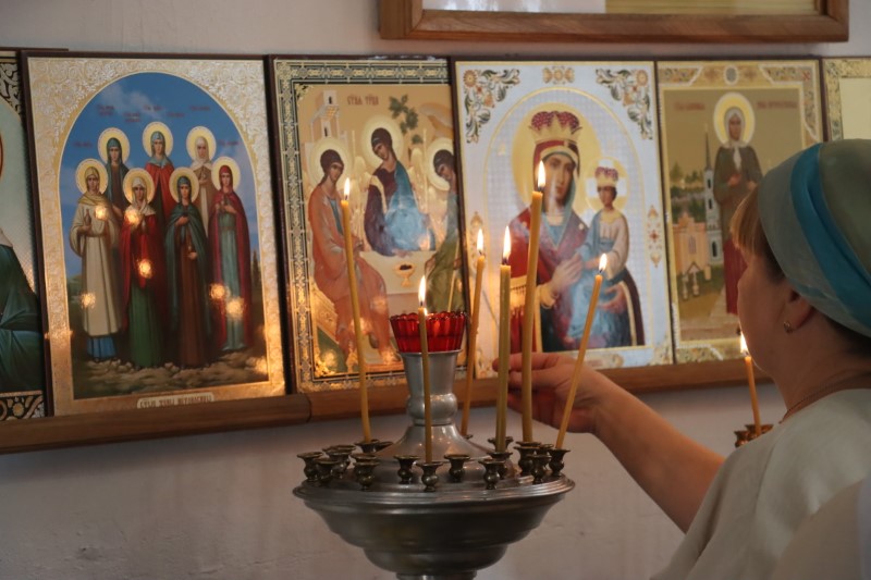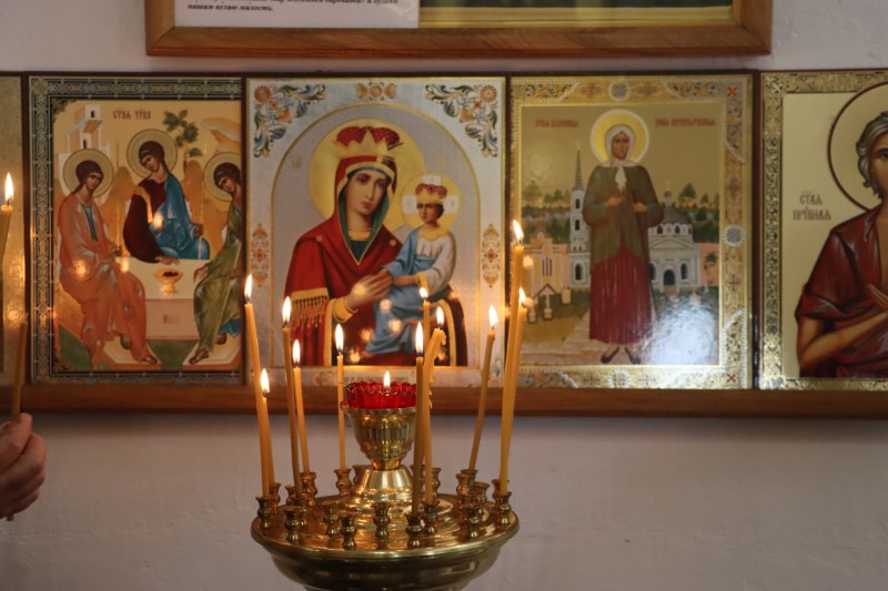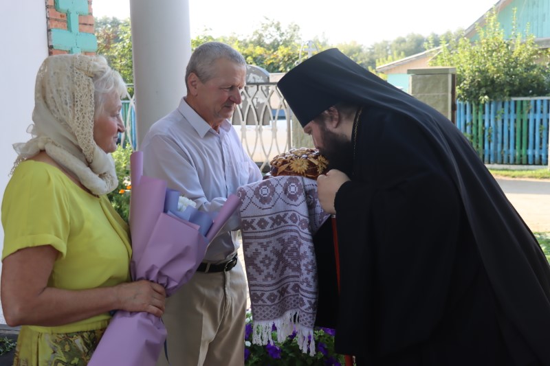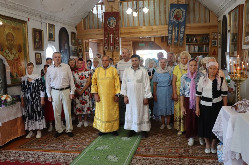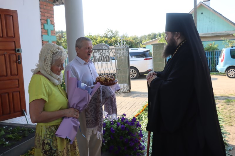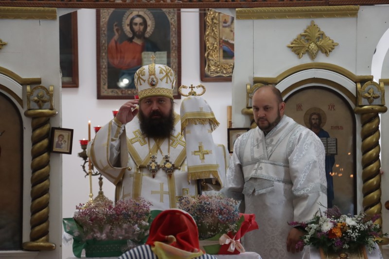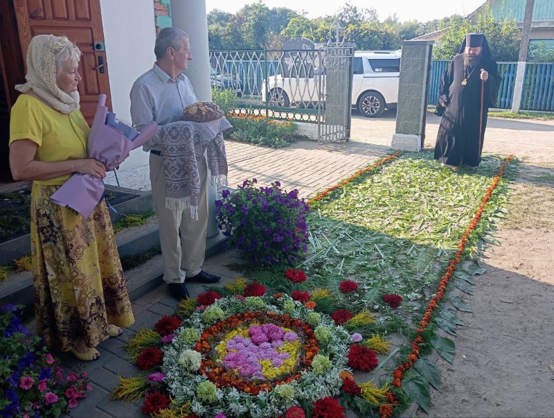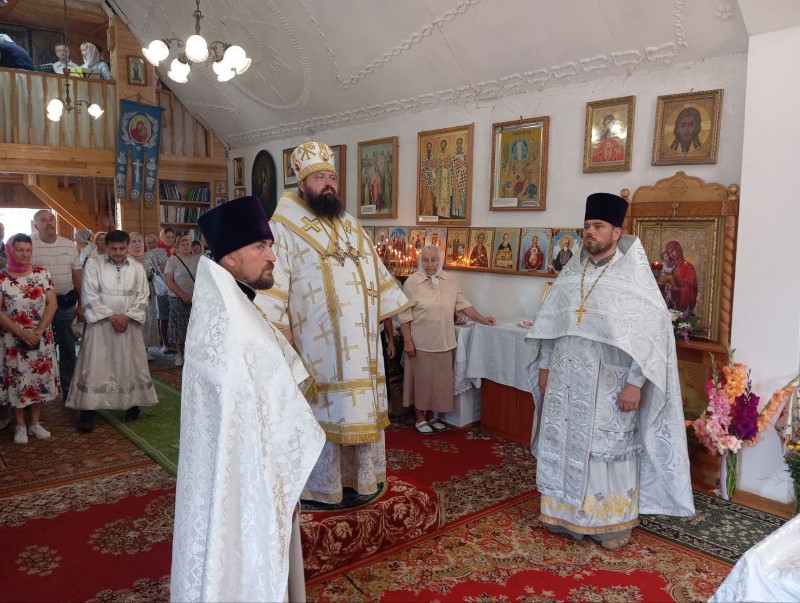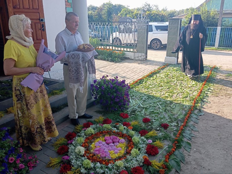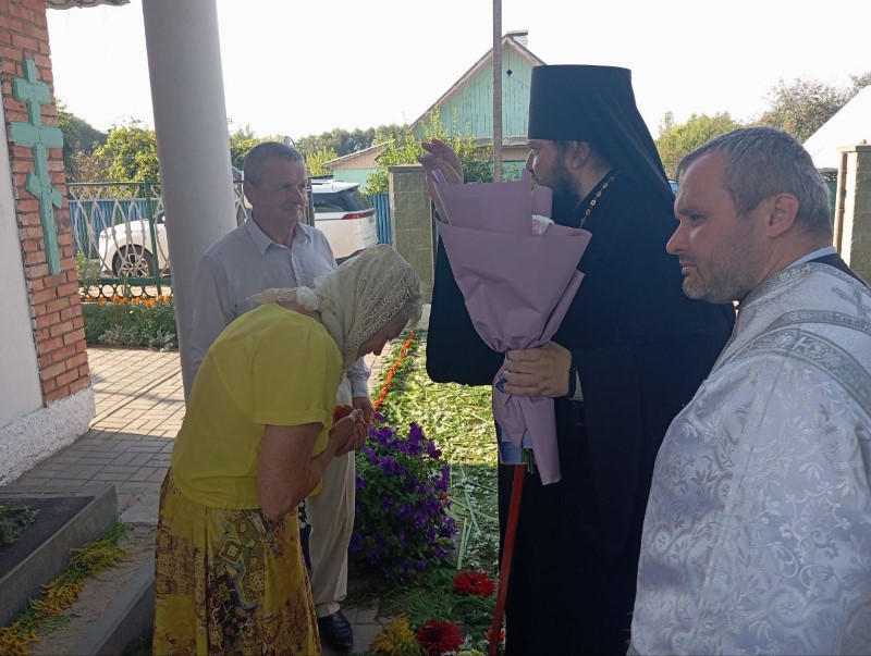 После торжественной встречи Преосвященнейший Амвросий начал служить Божественную Литургию, по окончании которой запланированы молебен с освящением плодов, Крестный ход и праздничная трапеза с участием прихожан.