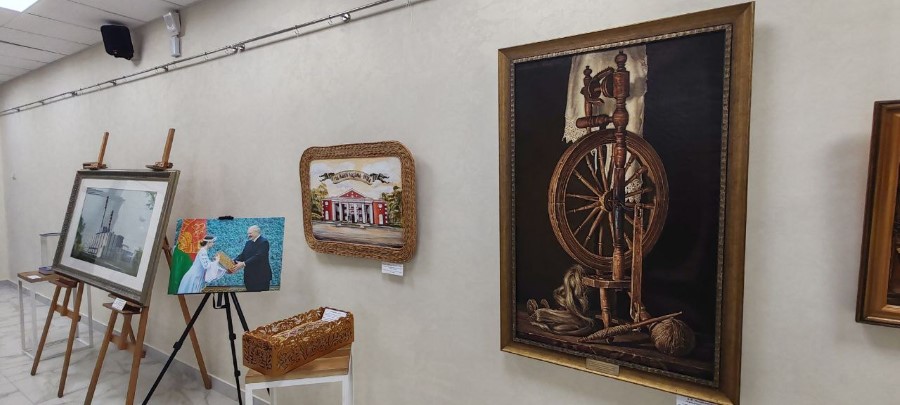 А на первом этаже солигорского Дворца культуры расположилась выставка подарков Президенту Республики Беларусь от трудовых коллективов, на которой представлено более 70 подарков Президенту Республики Беларусь, подаренных в период с 2000 по 2024 гг.