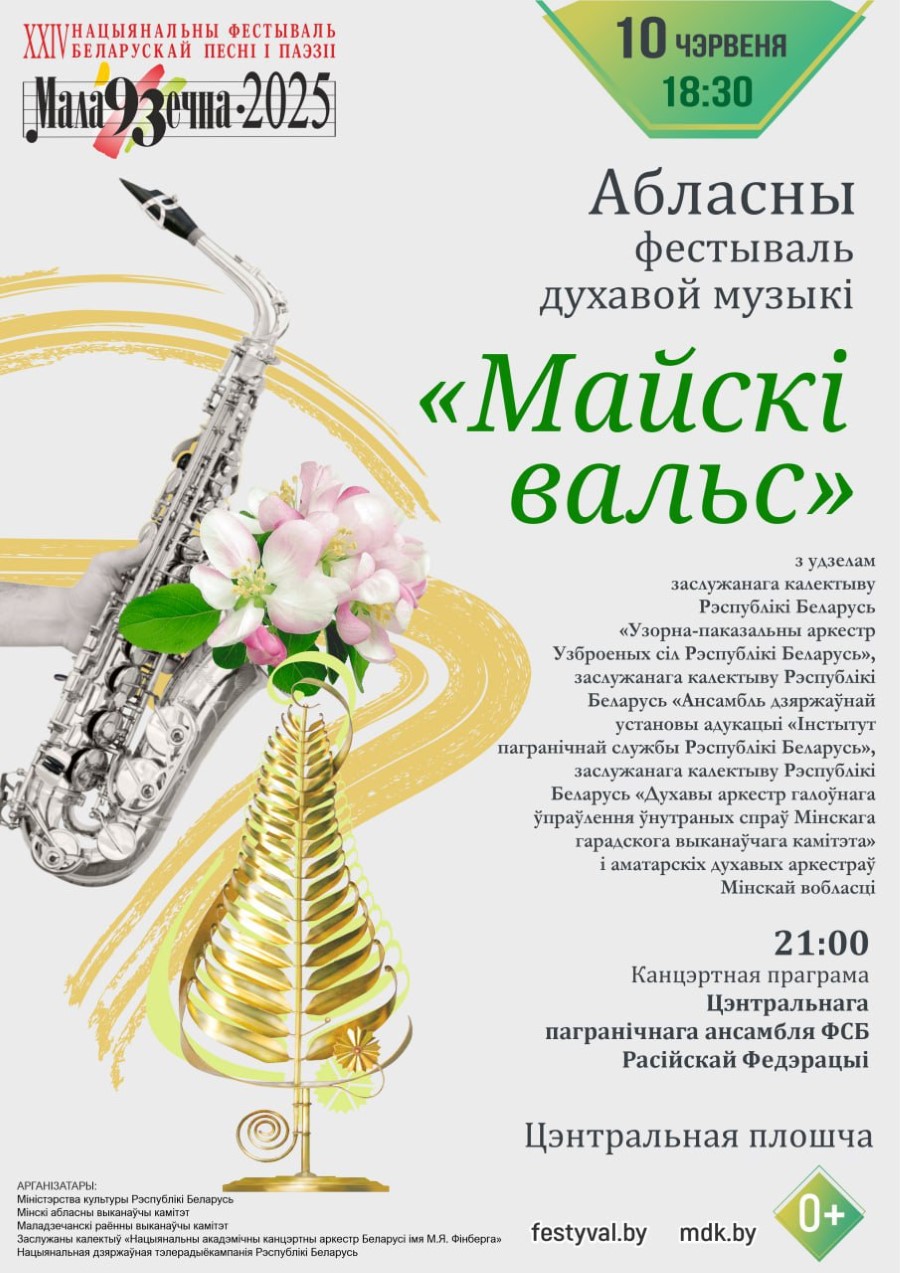 Событие станет ярким прологом фестиваля, подарив жителям и гостям города возможность насладиться мастерством ведущих духовых коллективов страны. Среди участников заявлены заслуженные коллективы Республики Беларусь «Образцово-показательный оркестр Вооруженных Сил Республики Беларусь», «Ансамбль ГУО «Институт пограничной службы Республики Беларусь», «Духовой оркестр ГУВД Мингорисполкома».