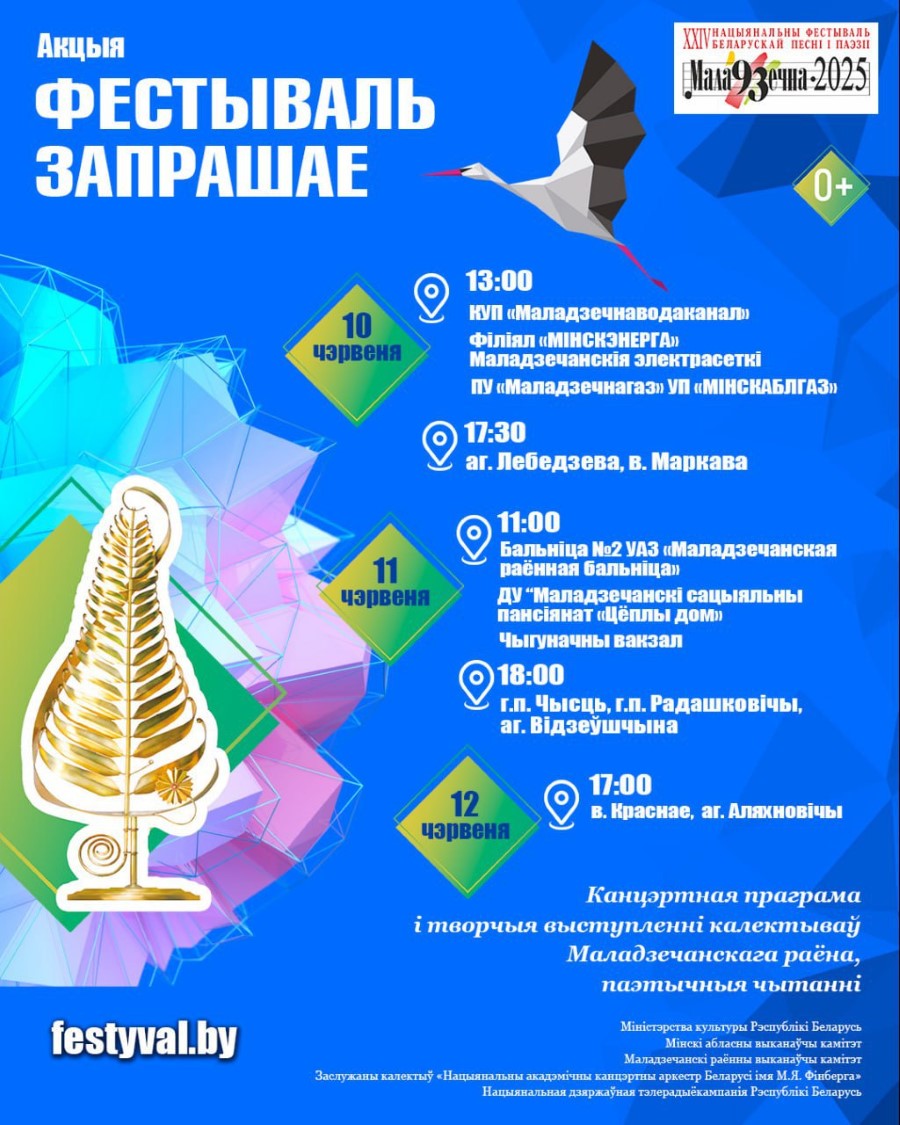С 10 по 12 июня в рамках акции «Фестываль запрашае» творческие коллективы региона заглянут в деревни, агрогородки и посёлки Молодечненского района и порадуют сельчан яркими концертными программами.