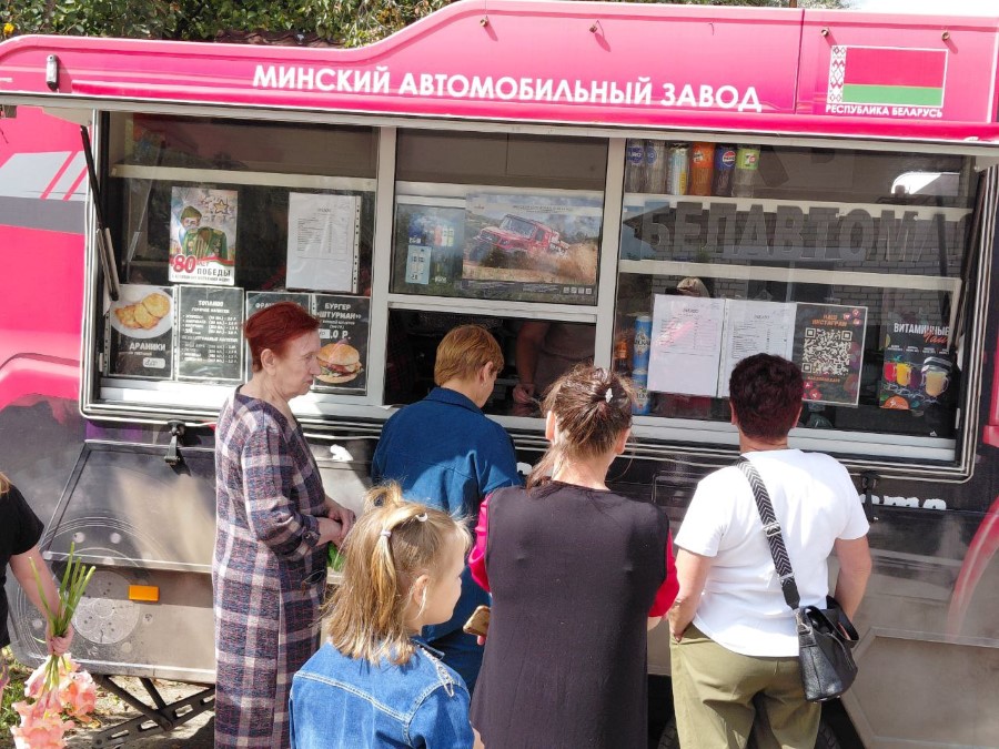 А также желающие могли приобрести: прохладительные напитки, кофе, чай, гамбургеры, хот-доги и мн.др. в фудтраке, который приехал помочь устроить праздник и порадовать жителей прямо из г.Минска.