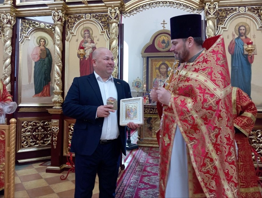 Глава района поздравил настоятеля Никольского храма протоиерея Илью Гончарука с праздником и вручил цветы, а также поставил свечу и позвонил в колокола. Далее почётные гости приняли участие в праздничном молебне.