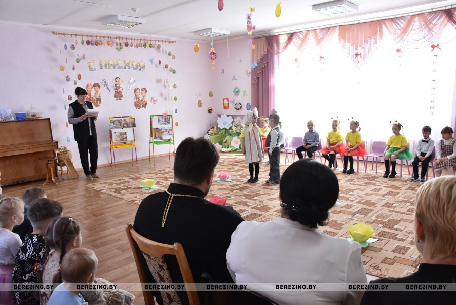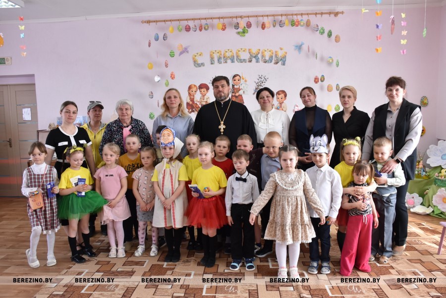 Благочинный Березинского церковного округа, протоиерей Илья Гончарук поздравил всех участников праздника со светлой Пасхой и вместе со своей младшенькой дочерью вручил детям пасхальные подарочки и пригласил на экскурсию в храм, на колокольню. Пасхальный звон колоколов оповещает о торжестве добра и света и сопутствует всем пасхальным действиям.