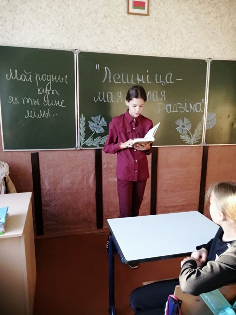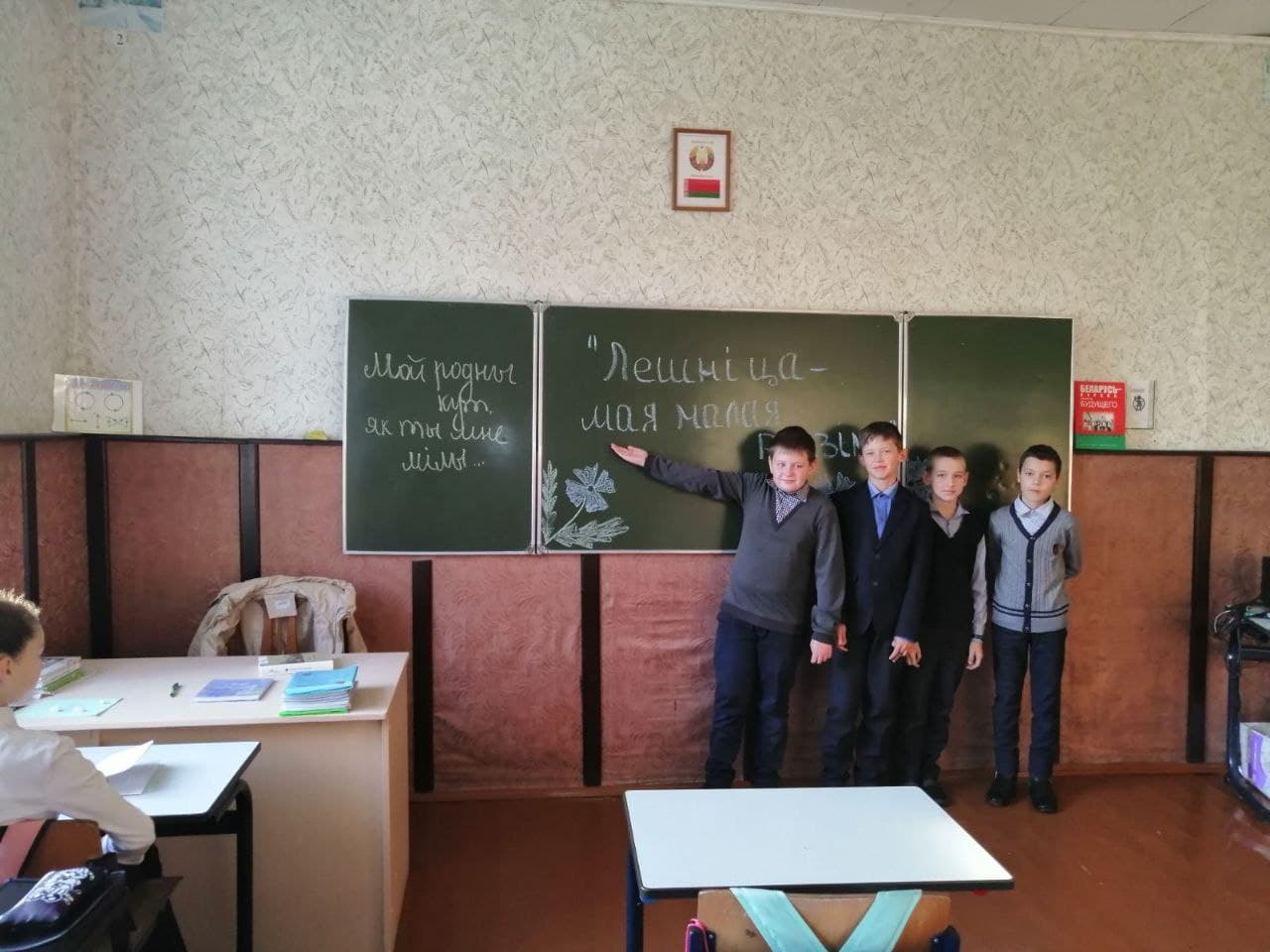 В рамках проведения педагогического марафона «Единство, гражданственность, патриотизм» в ГУО «Лешницкий учебно — педагогический комплекс детский сад — средняя школа» с учащимися 1 класса проведена беседа-путешествие «Моя Родина — Республика Беларусь». С учащимися 6 класса прошёл классный час «Беседа о малой родине». Цель мероприятий — гордость за свою республику и любовь к малой родине.