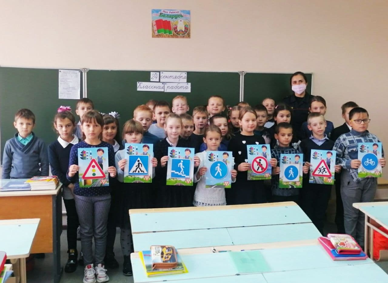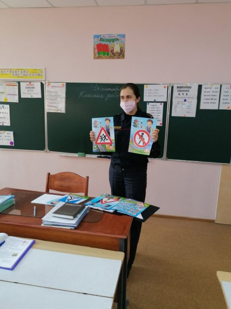 Ребят познакомили с правилами по безопасному поведению на дороге (переход проезжей части, езда на велосипеде, перевозка пассажиров в автотранспорте), а также указано на обязательное использование в тёмное время суток световозвращающих элементов. Ст. Инспектор по АП ОГАИ Березинского РОВД Сигаёва Юлия Владимировна вместе с детьми вспомнила какие бывают дорожные знаки и что они обозначают.