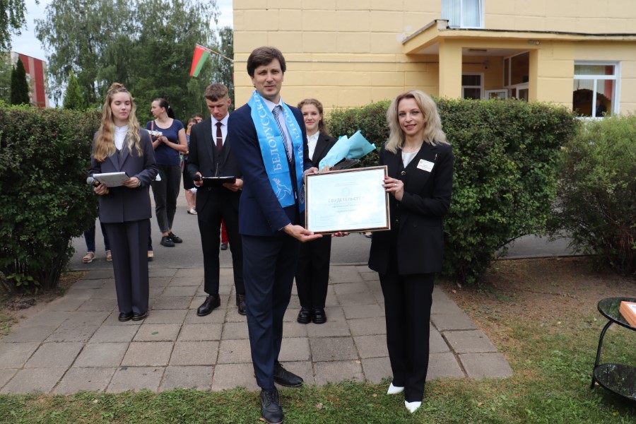 Далее Павел Сергеевич вручил директору Березинской гимназии Свидетельство о том, что данное учреждение образования становится частью проекта. Также Наталья Бурцева была награждена медалью фонда мира «Во имя мира, дружбы и добра».