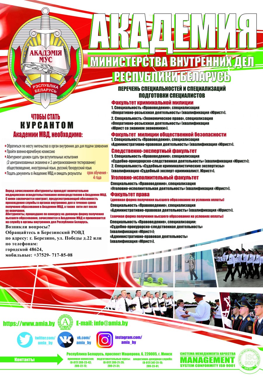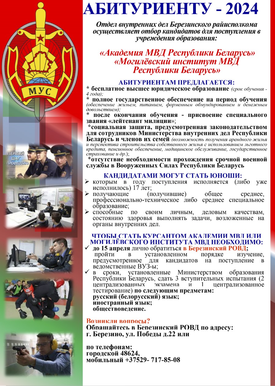 Отдел внутренних дел Березинского райисполкома на конкурсной основе направляет юношей в возрасте от 17 до 25 лет для поступления на дневную форму обучения в Академию МВД Республики Беларусь и Могилевский институт МВД Республики Беларусь в 2024 году.