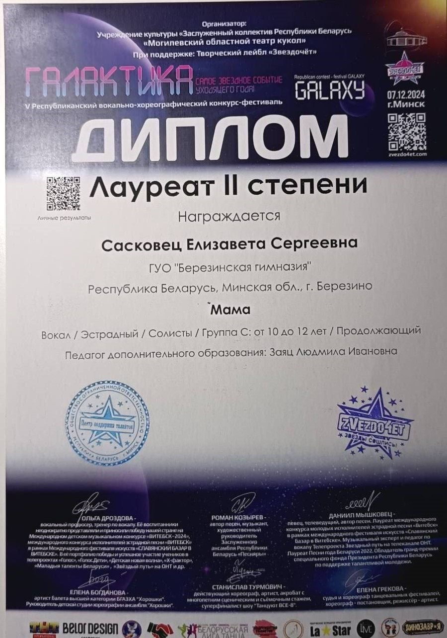 Она стала Лауреатом II степени V Республиканского вокально-хореографического конкурса-фестиваля «ГАЛАКТИКА».