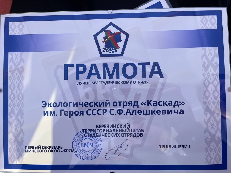 Лучший экологический отряд: «Каскад» имени Героя Советского Союза Алешкевича Степана Филимоновича (ТСШО Березинской РО ОО «БРСМ»).