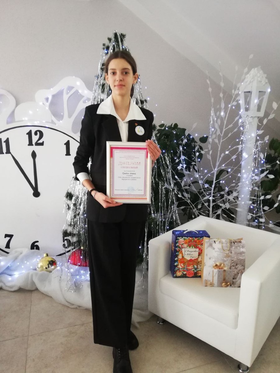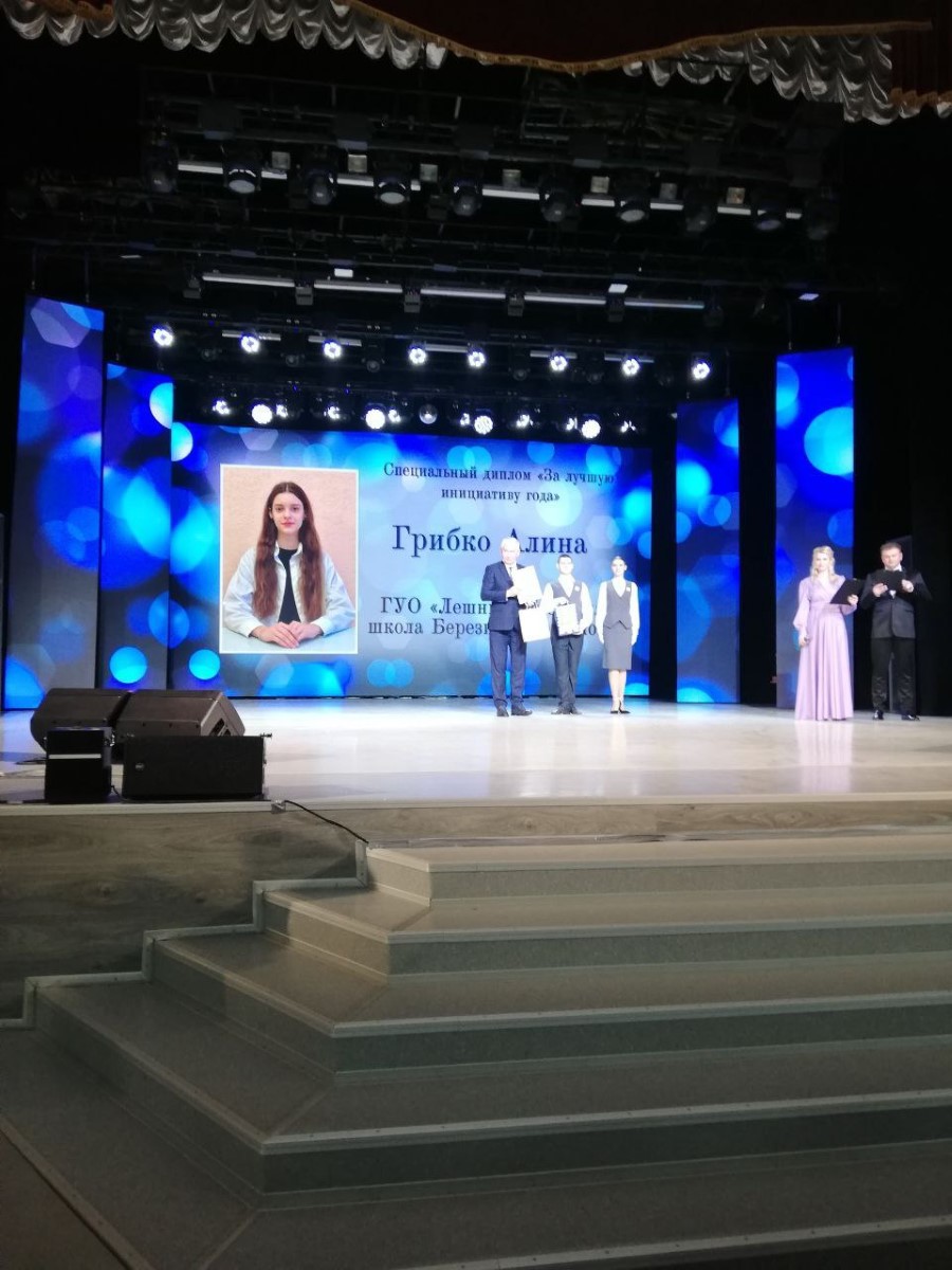 Специальным ДИПЛОМОМ "За лучшую инициативу года" Главным управлением по образованию Минского областного исполнительного комитета награждена Грибко Алина, учащаяся 9 класса ГУО "Лешницкая средняя школа Березинского района" за участие в областном этапе республиканского конкурса "ЛИДЕР ГОДА!"