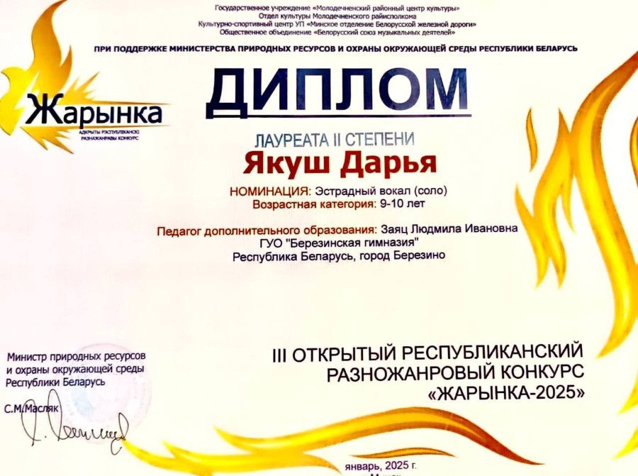 Учащаяся ГУО «Березинская гимназия» Якуш Дарья Лауреат II степени в номинации эстрадный вокал 9-10 III Открытого Республиканского разножанрового конкурса «Жарынка». Педагог Л.И. Заяц.