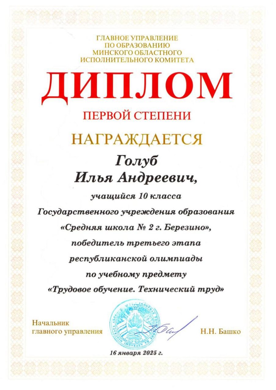 Учащиеся 10 класса ГУО "Средняя школа №2 г. Березино" успешно представили Березинский район на третьем этапе республиканской олимпиады по учебному предмету "Трудовое обучение": Голуб Илья получил Диплом I степени, Колентионок Матвей - Диплом III степени.