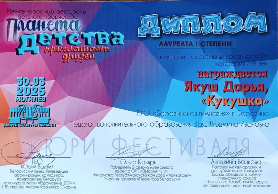 В Международном фестивале детского творчества «Планета детства» Дарья стала обладательницей диплома Лауреат I степени в номинации вокал, соло 7-9 лет. Педагог - Людмила Заяц.