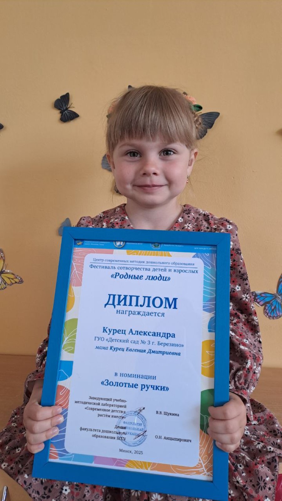 Воспитанница ГУО "Детский сад № 3 г.Березино" стала обладательницей диплома IV фестиваля сотворчества детей и взрослых "Родные люди" в номинации "Золотые ручки". Поздравляем и желаем дальнейших успехов!