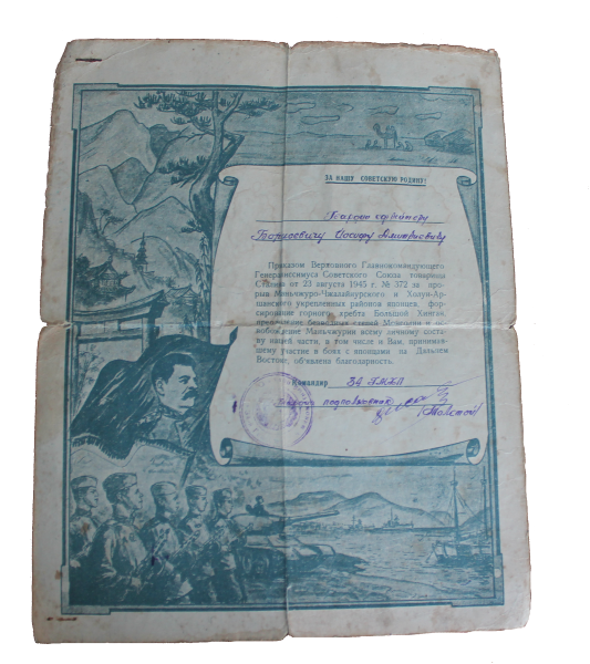 Сёння аб гераічным мінулым бацькі нагадваюць яго медалі “За перамогу над Германіяй”, “За перамогу над Японіяй”, “За адвагу” і шматлікія падзякі. У адной з іх гаворыцца: “Вместе со своими однополчанами Вы участвовали в героическом походе через безводные пустыни Монголии и горные перевалы Большого Хингана, и через всю Маньчжурию пронесли наше знамя в священный для русского сердца город Порт-Артур. За ратные труды и военные подвиги Вы неоднократно удостаивались благодарности великого Сталина. За верную службу отчизне выражаем Вам благодарность. Возвращаясь домой, не забывайте своих боевых соратников, своих однополчан. Высоко держите честь и достоинство непобедимого сталинского воинства, будьте верны Красному Знамени, которое привело нас к Великой Победе над врагами Родины на Западе и на Востоке. Мы уверены, что и на фронте мирного труда, как и на боевом фронте, Вы будете примерным, честным бойцом за процветание Родины, за ее честь и славу.