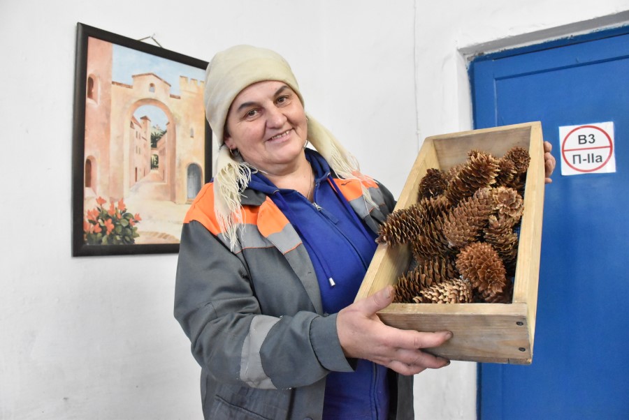 У адным з памяшканняў сушылкі, дзе шчыльным дываном ляжаць cасновыя шышкі, стаіць незабыўны ўстойлівы водар жывіцы.
