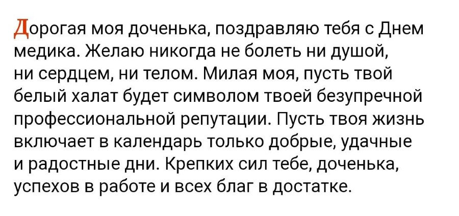 Мама дорогая, сегодня твой профессиональный праздник. Поздравляю тебя с Днем медика! Ты выбрала себе очень ответственную профессию и с большим успехом трудишься. Я горжусь тобой! Будь здорова и помогай в этом другим.