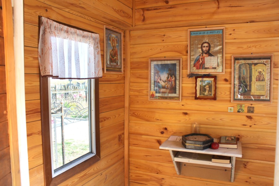 И вот мы со Светланой Ивановной на месте. На дороге недалеко от кладбища (а оно находится почти в километре от деревни) отмечаем установленный поклонный крест. А вот и кладбище, расположено на открытой местности, заключенное в бетонное ограждение. Новая металлическая калитка. Вдоль забора достаточная территория для парковки автомобилей. А самой главной достопримечательностью этого святого места является небольшая часовенка в честь Святого преподобного Серафима Саровского, расположенная слева от входа на кладбище.