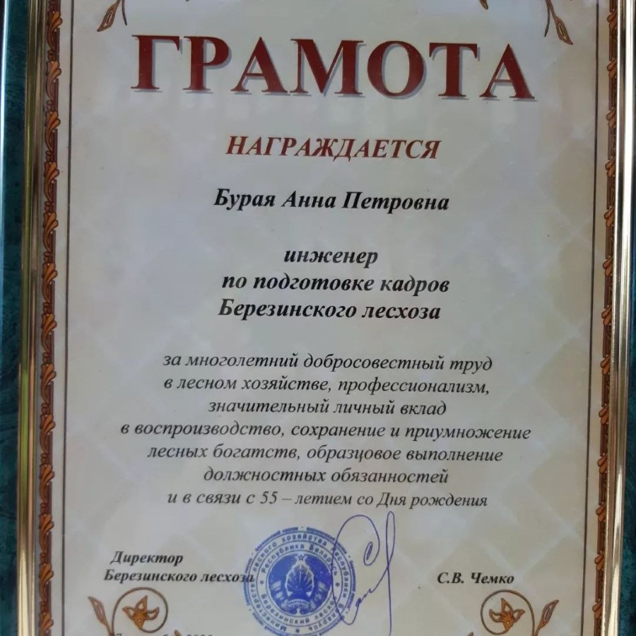 Свой юбилей празднует Анна Петровна Бурая – инженер по подготовке кадров Березинского лесхоза. Анна Петровна работает в Березинском лесхозе уже более 10 лет.
