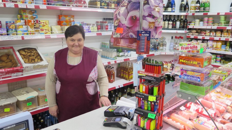 Пенсионерку Галину Лапытько мы встретили возле магазина. Она рассказывает, что её в магазине устраивают и цены, и выбор продуктов. Александра Болсуна женщина поблагодарила за то, что он приходил к ней в составе смотровой комиссии. У Галины Карповны есть всё необходимое: дрова на зиму, вода из своего колодца, на улице возле дома исправно горит фонарь.