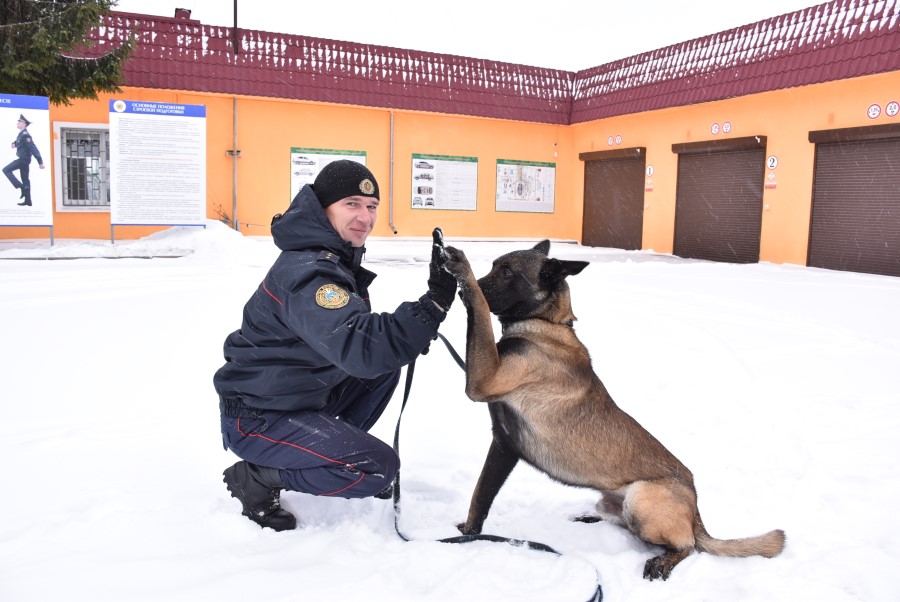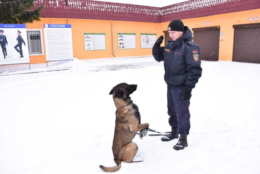 В Березинском отделении Департамента охраны при Министерстве внутренних дел сегодня три действующих кинолога и еще один готовится заступить на эту службу. Анатолий Жоров с Шайром недавно вернулся после обучения из Ростовской школы служебно-розыскного собаководства МВД Российской Федерации. Он рассказывает, что своего питомца, как в спорте, нужно обучать и общим командам, таким как «сидеть», «лежать», «место», так после и специальным, как найти по предмету человека, или выбрать из разных людей, кому принадлежит вещь. Шайр на данный момент оправдывает все надежды.