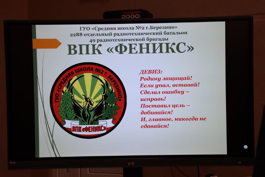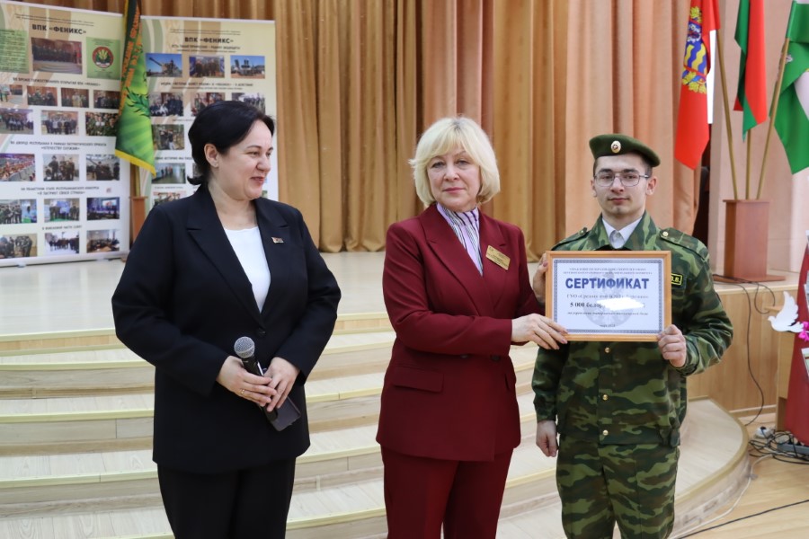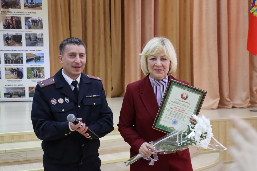Заместитель начальника Березинского РОВД подполковник милиции Геннадий Рабиза вручил директору СШ№2 Светлане Абрамович Благодарность начальника Березинского РОВД за активное участие в патриотическом воспитании подрастающего поколения, гражданскую позицию, бесценный труд в области сохранения исторической памяти и в связи с годовщиной со дня создания военно-патриотического клуба «Феникс».