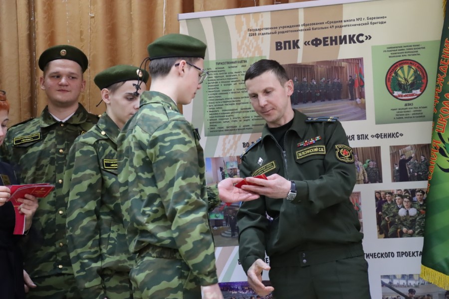 Начальник обособленной группы Березинского района майор Максим Клюев вручил воспитанникам клуба удостоверения призывника. Ведущие напомнили: удостоверение призывника является личным документам воинского учета и в последующем будет необходимо для трудоустройства, поступления в учреждение образования и регистрации по места жительства.