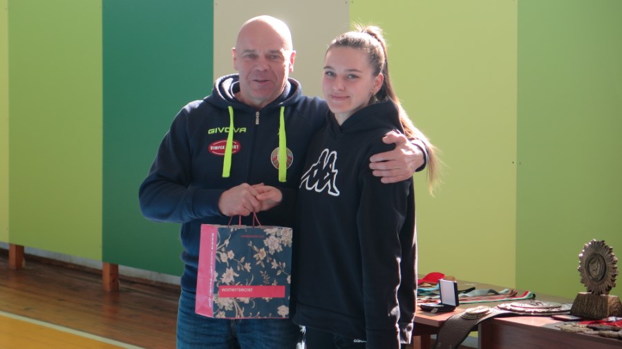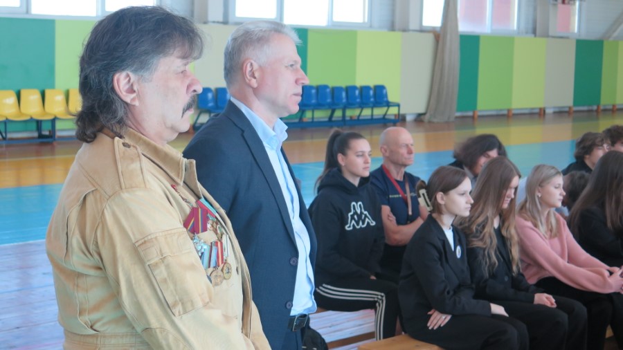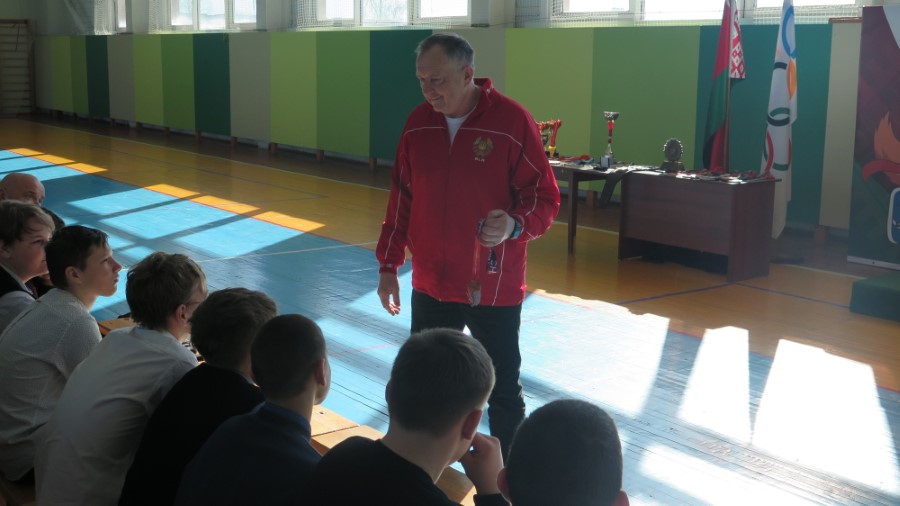 Затем внимание детей занял Вячеслав Хоронеко, шестикратный рекордсмен книги рекордов Гиннеса, семидесяти восьмикратный рекордсмен мира в произвольном подъеме гирь, основатель дисциплины Белорусский гиревой жим в федерации НАП. Он говорил, что занимался спортом с детства, а в середине 80-х на профессиональном уровне выступал по гиревому спорту, стал атлетом высочайших достижений. С 90-х годов начал пробовать различные шоу-элементы и трюки с тяжестями: поднимал в шпагате, с кувырками, под водой. Часть самых сложных его рекордов школьники могли увидеть на видео-панели. Вячеслав Васильевич уделил внимание одному из своих коронных движений – белорусскому жиму. Выполняют его, выжимая лежа на полу гири определенного веса. В его золотом возрасте это лучшее силовое упражнение.