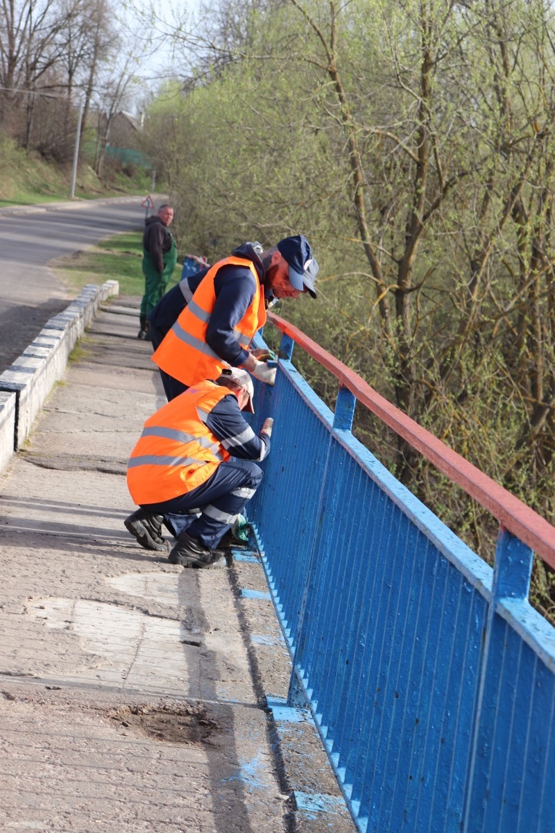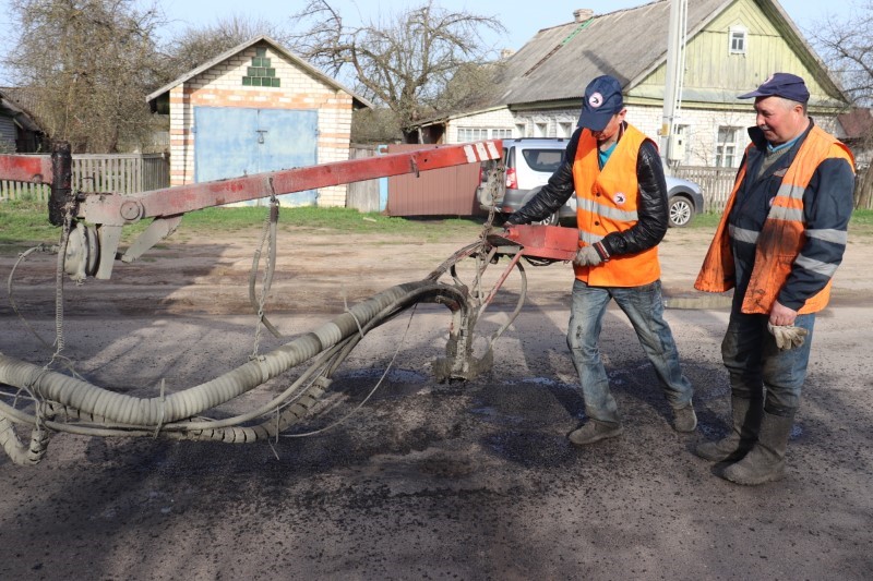 На улице Энгельса за работой по проведению ямочного ремонта мы застали ветерана ДРСУ-192 Владимира Охманюка и его молодого напарника Евгения Булойчика, который только делает свои первые самостоятельные шаги в овладении специфики работы с «Тайфуном» и перенимает опыт старшего товарища. Кстати, завершив работы в городе, экипаж отправится для проведения аналогичной работы на дороге возле деревни Капланцы. А там уже с утра находится и целая бригада дорожников: они приступили к покраске, оштукатуриванию и необходимому ремонту моста через Клеву, который как раз и находится в этой деревне.