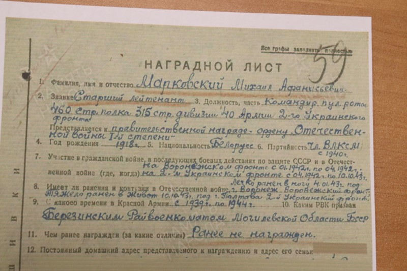 Победу в ней ковали простые солдаты и офицеры. Одним из них был и мой отец – Михаил Афанасьевич Марковский, 1918 года рождения, уроженец д. Вьюновка нашего Березинского района. Так случилось, что военную форму он одел еще в 1939 году, став офицером и имел звание старшего лейтенанта. Его боевой путь был непростым и героическим, полным мужества и отваги. К сожалению, моему отцу не суждено было дойти до Берлина и оставить автограф на стене Рейхстага: после тяжелого ранения в живот, полученного им в октябре 1943 года, он был комиссован. О том, насколько отважным был Михаил Марковский, свидетельствуют скупые сведения, которые приводятся в представлении его к награждению орденом Отечественной войны первой степени. Почитаем их вместе.
