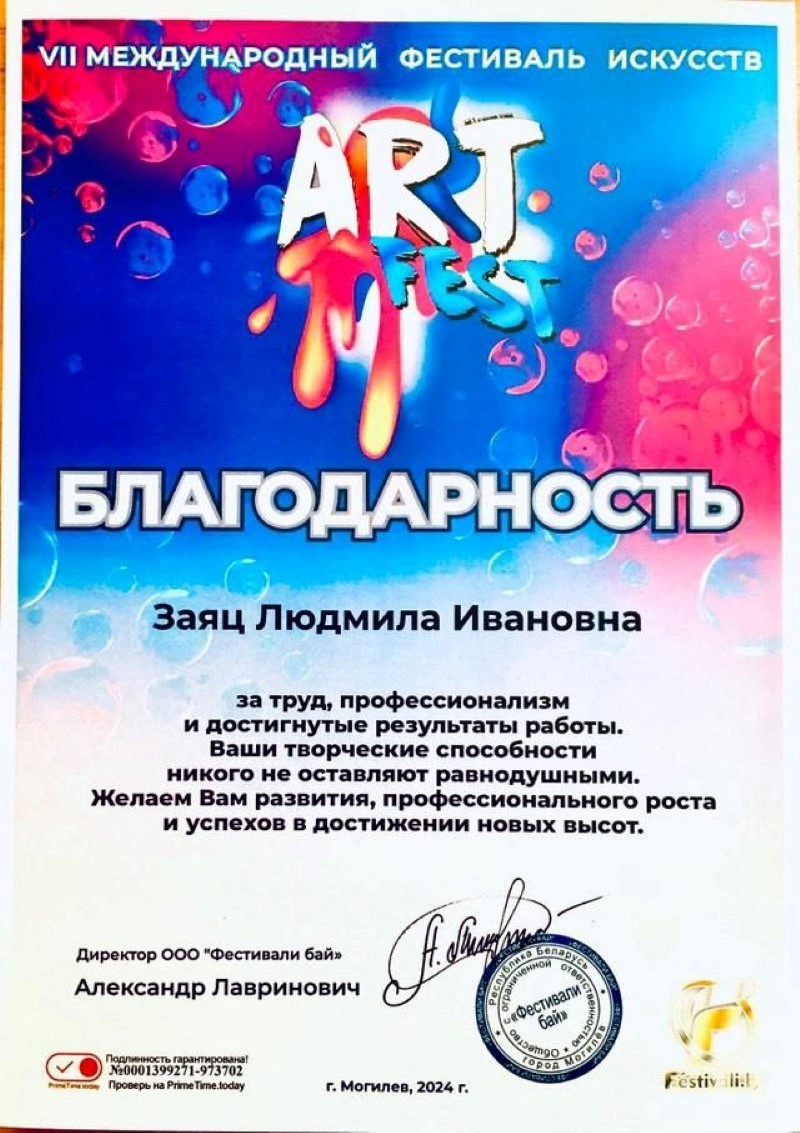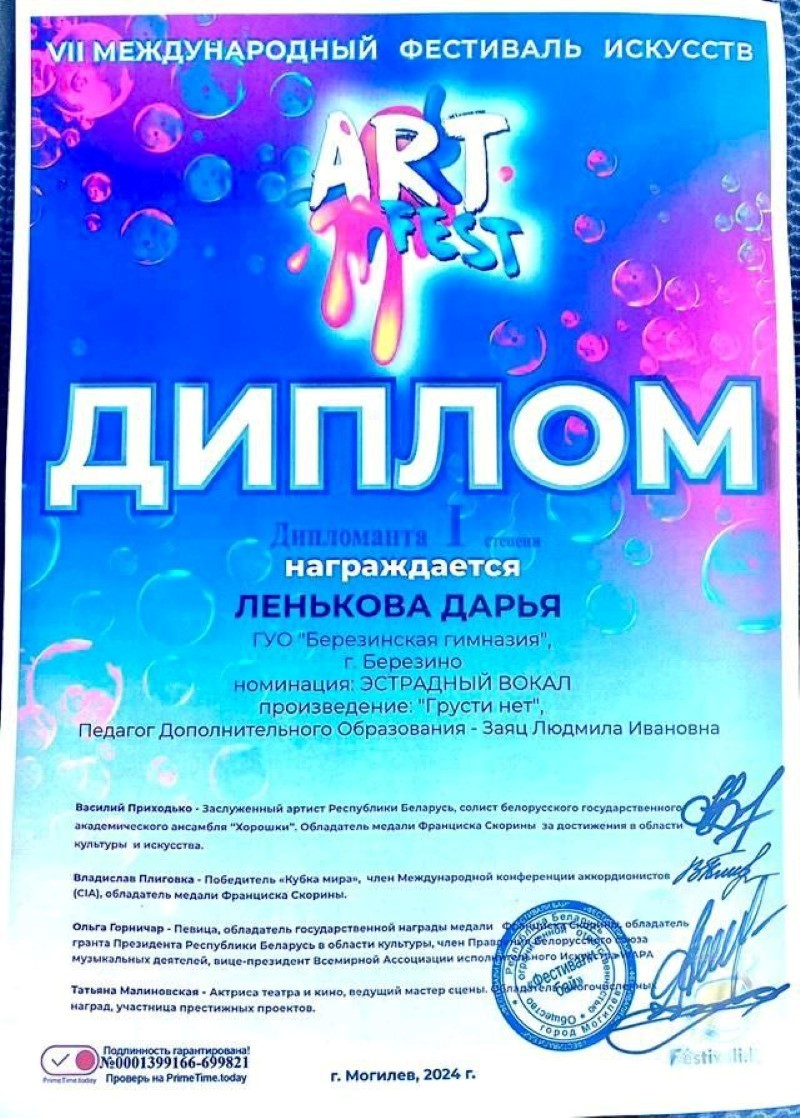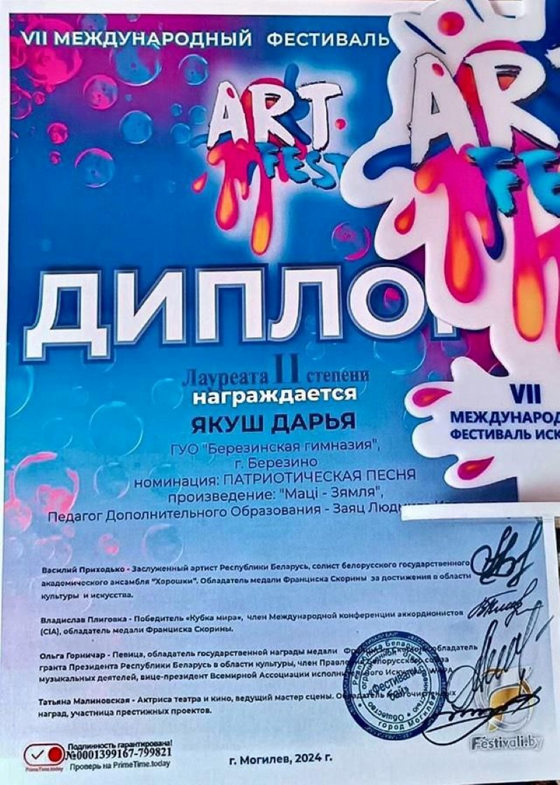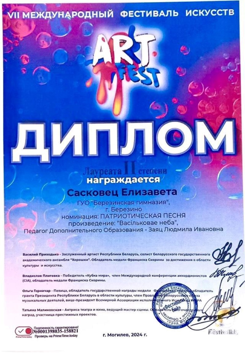 На Vll Международном фестивале “ART FEST” в номинации «Патриотическая песня» в возрастной категории 10-11 лет Сасковец Елизавета награждена дипломом Лауреата II степени.