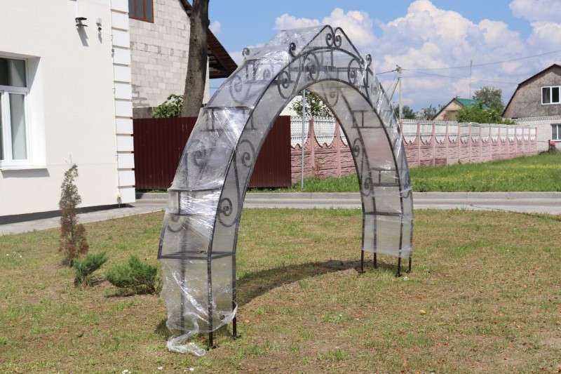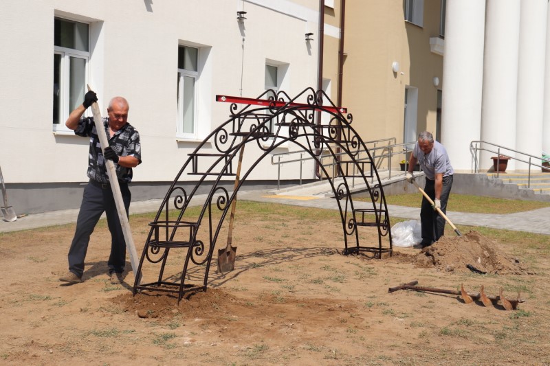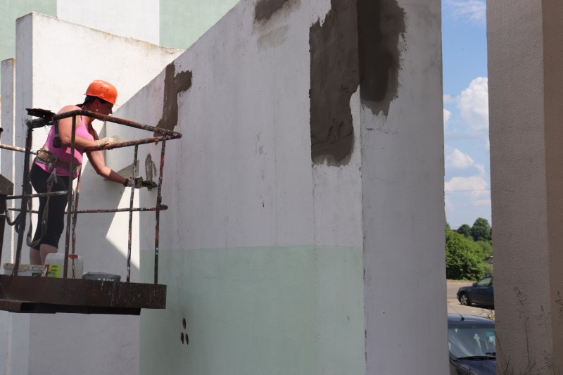 А на благоустройстве здания гостиницы трудятся работники Березинской ЖКХ. Тут ликвидируются образовавшиеся трещины и ведется штукатурка стены и арки.