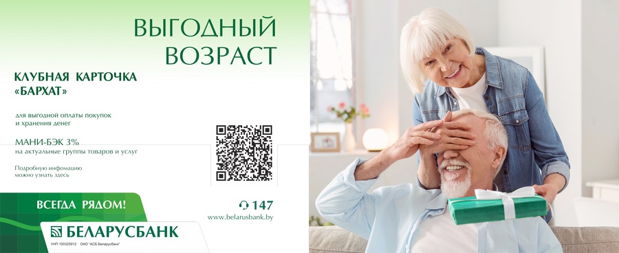 Учитывая названные изменения, Беларусбанк предлагает позаботиться о переводе в банк выплаты пенсии и других социальных выплат, оформив карту Клуба «Бархат». Срой ее действия – 5 лет. Оформляется в белорусских рублях, бесплатно и только к банковскому счету. Карточка хороша тем, что на нее не только поступают деньги, она еще позволяет ежемесячно возвращать до 3 процентов от суммы покупок и пользоваться более лояльными условиями по банковским продуктам.