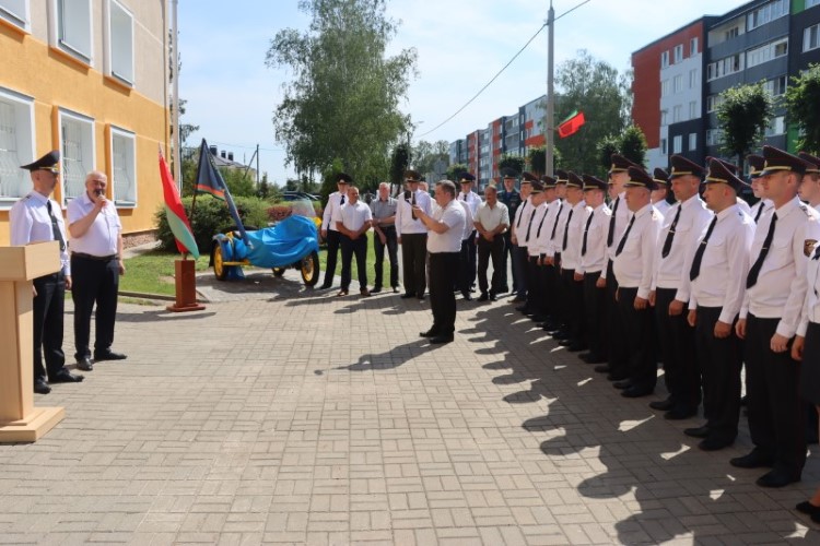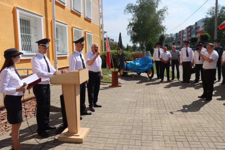 После поздравительной речи, которую произнесли начальник Березинского РОВД подполковник милиции Андрей Заяц и бывший начальник Березинского РОВД полковник милиции Виталий Дмитриев, почетное право открыть музейный экспонат было передано Андрею Зайцу и председателю ветеранской организации Березинского РОВД полковнику милиции Сергею Семеняко.