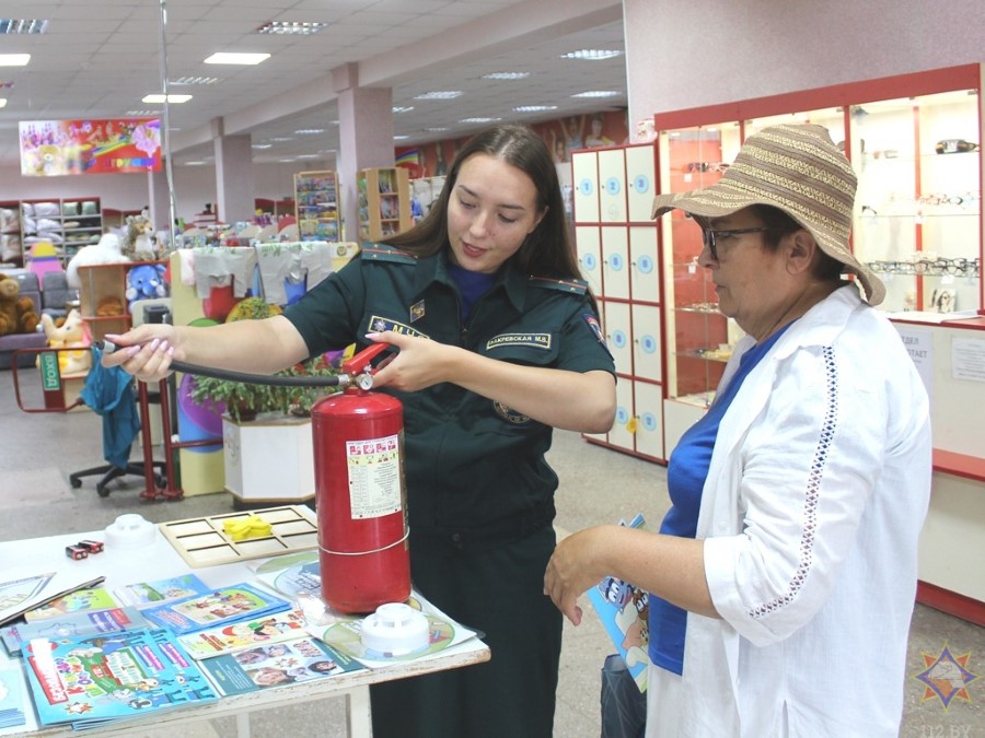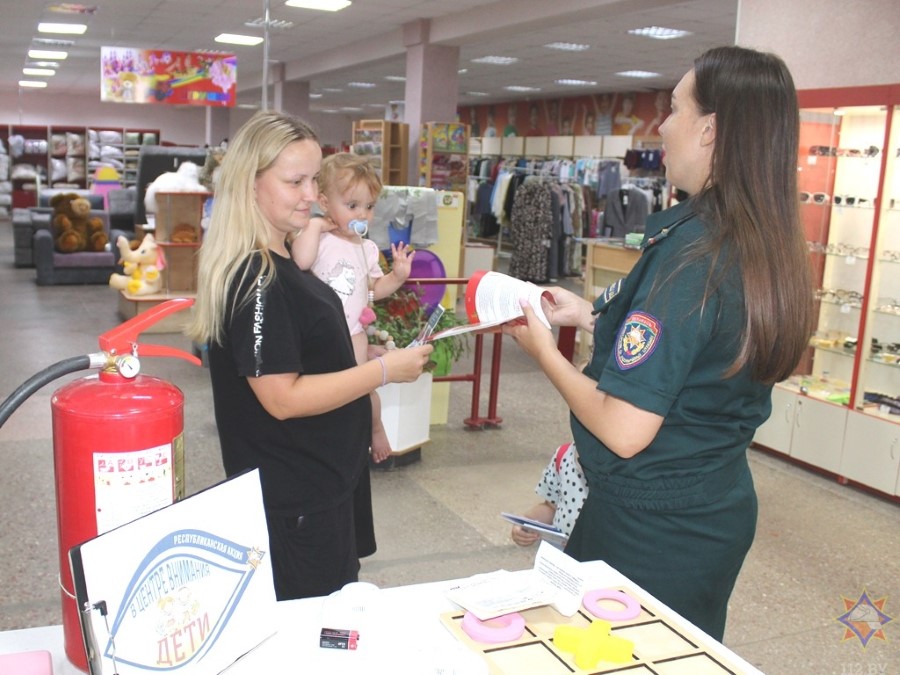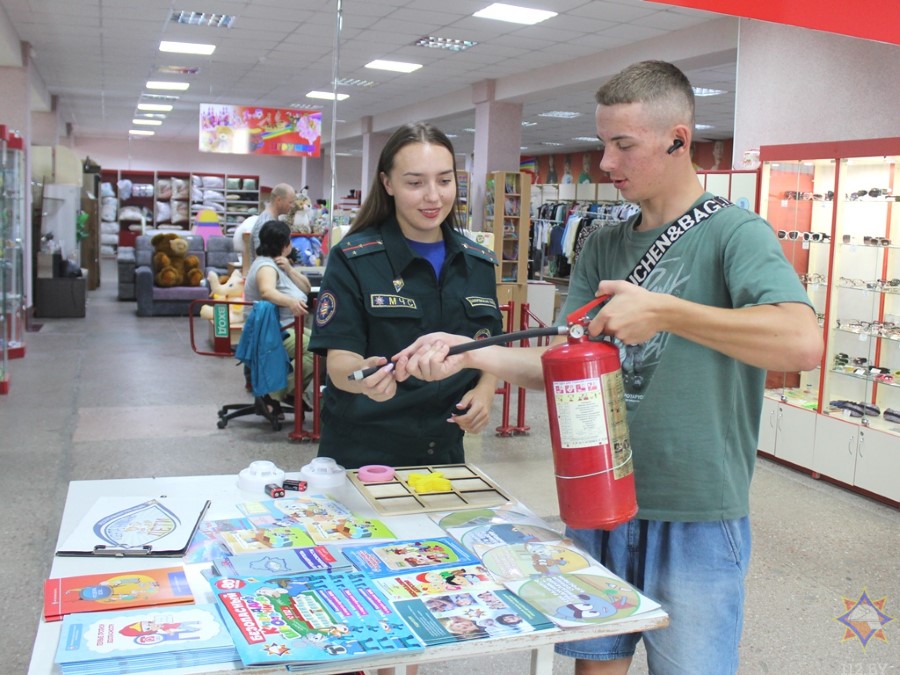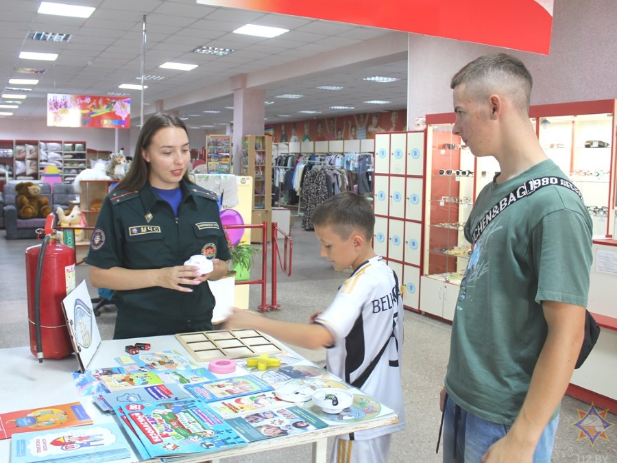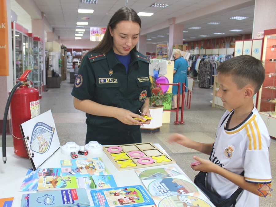 У аддзеле з дзіцячымі таварамі з пакупнікамі пагутарыла інспектар райаддзела па надзвычайных сітуацыях Маргарыта Закрэўская. Яна арганізавала гульневую пляцоўку, дзе можна было навучыцца карыстацца вогнетушыцелем, патэлефанаваць у службу ратавання, пагуляць у крыжыкі-нолікі, даведацца пра знакі пажарнай эвакуацыі.