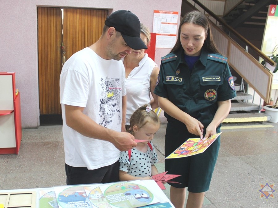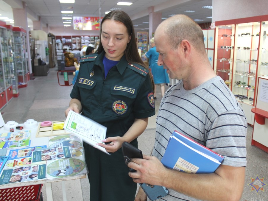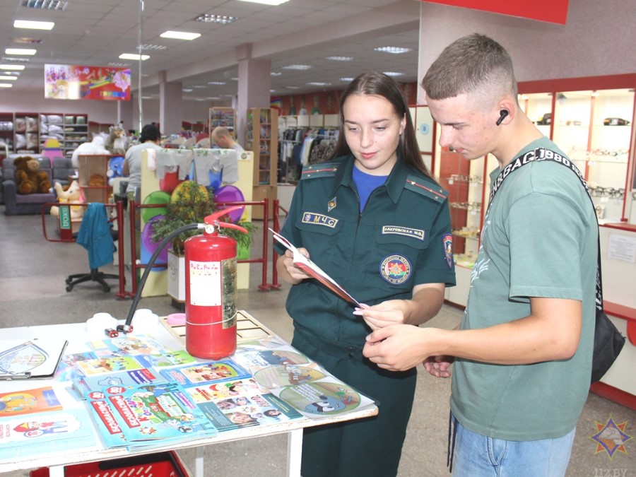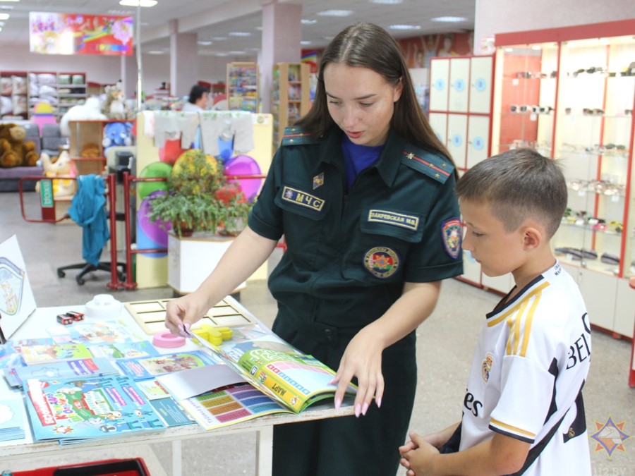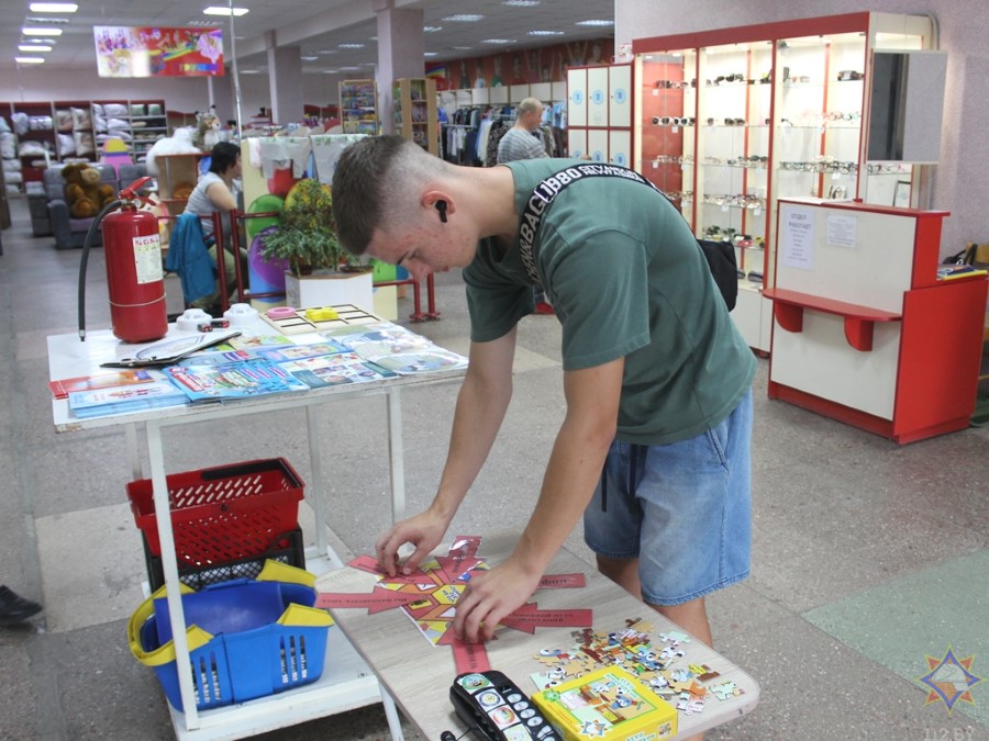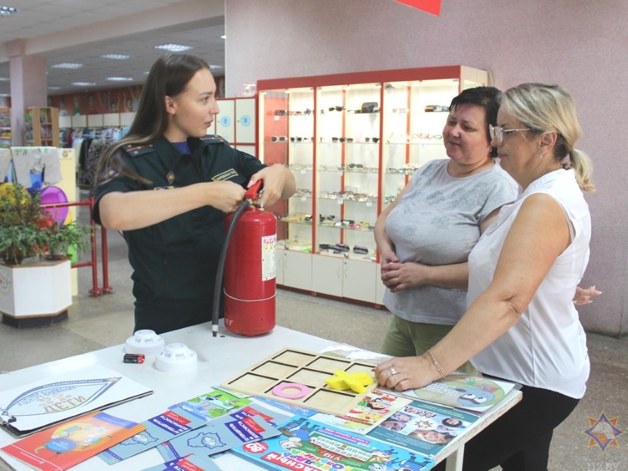 У аддзеле з дзіцячымі таварамі з пакупнікамі пагутарыла інспектар райаддзела па надзвычайных сітуацыях Маргарыта Закрэўская. Яна арганізавала гульневую пляцоўку, дзе можна было навучыцца карыстацца вогнетушыцелем, патэлефанаваць у службу ратавання, пагуляць у крыжыкі-нолікі, даведацца пра знакі пажарнай эвакуацыі.