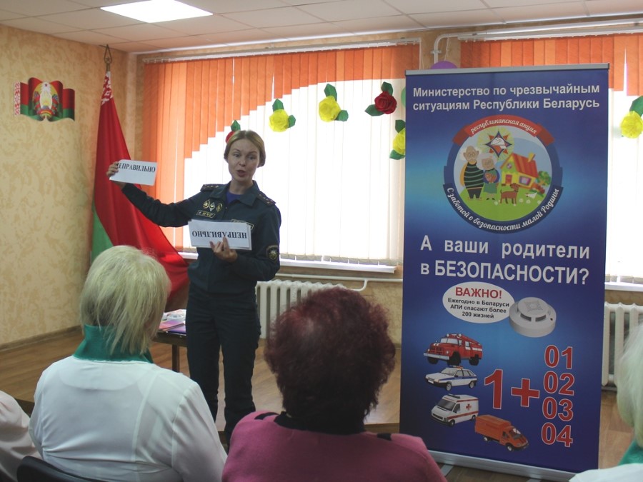 Спасатели всегда готовы помочь вам сделать жизнь пожилых родственников более безопасной. Так, в рамках кампании «С заботой о безопасности малой Родины» березинские спасатели вместе с юными помощниками из клуба «Сирена» провели мероприятия в ГУ «Березинский ТЦСОН» и ГУ «Березинский РЦК». Использовались игровые формы работы, вручалась наглядная продукция. Особенно понравился пожилым людям розыгрыш пожарных извещателей: ответив на три вопроса, можно было получить этот полезный прибор в подарок. Каждому участнику акции мы вручили буклеты «Золотые правила золотого возраста» и памятки от представительства Белгосстраха. Плечом к плечу работал с нами и активист березинского районного комитета ОО «БРСМ»: участникам акции вручались открытки с добрыми пожеланиями от союза молодежи, магниты, фликеры.