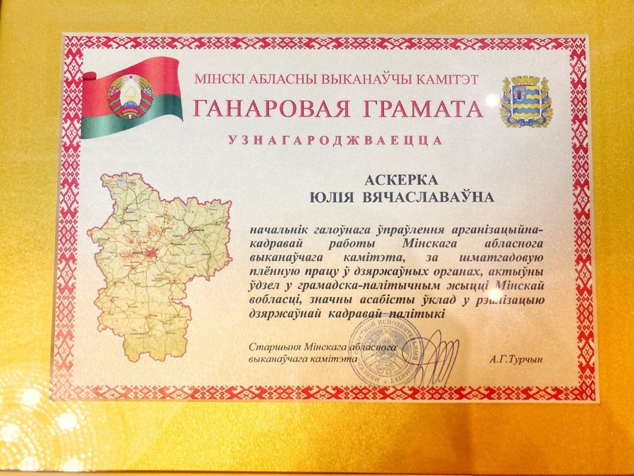 Начальник главного управления организационно-кадровой работы Минского облисполкома награждена Почетной грамотой за многолетний плодотворный труд в государственных органах, активное участие в общественно-политической жизни Минской области, значительный личный вклад в реализацию государственной кадровой политики.