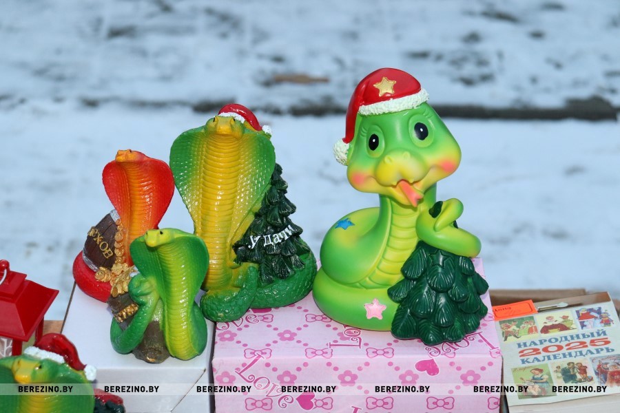 Был представлены на ярмарке и сувенирные товары новогодней тематики. Каких только изображений змеи (символа будущего года) вы не отыщите там. Да и материал, на котором они сделаны, тоже весьма разнообразный. Здесь же можно купить пледы, подушки, теплые носочки и много иного товара зимнего ассортимента. Да, и конечно же елочки и сосенки. Правда, искусственные. Но вот со следующей ярмарки поступят в продажу и натуральные – от Березинского лесхоза.