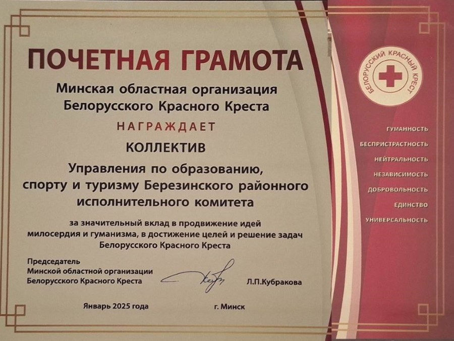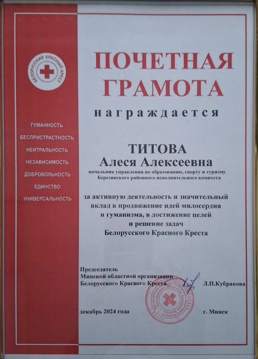 Минской областной организацией Белорусского Красного Креста награждена Почётной грамотой за активную деятельность и значительный вклад в продвижение идей милосердия и гуманизма, в достижение целей и решение задач Белорусского Красного Креста Алеся Алексеевна Титова, начальник управления по образованию, спорту и туризму Березинского районного исполнительного комитета.